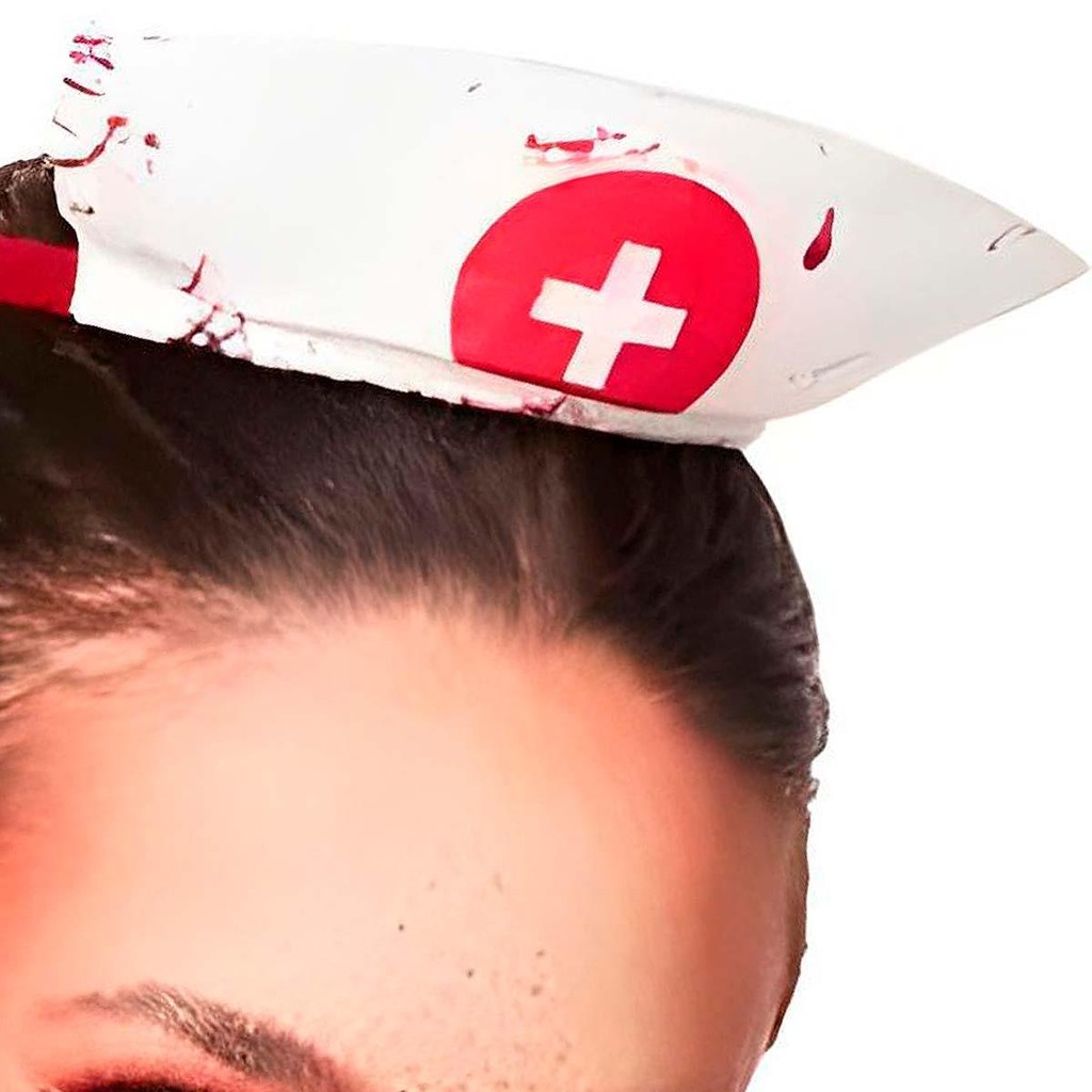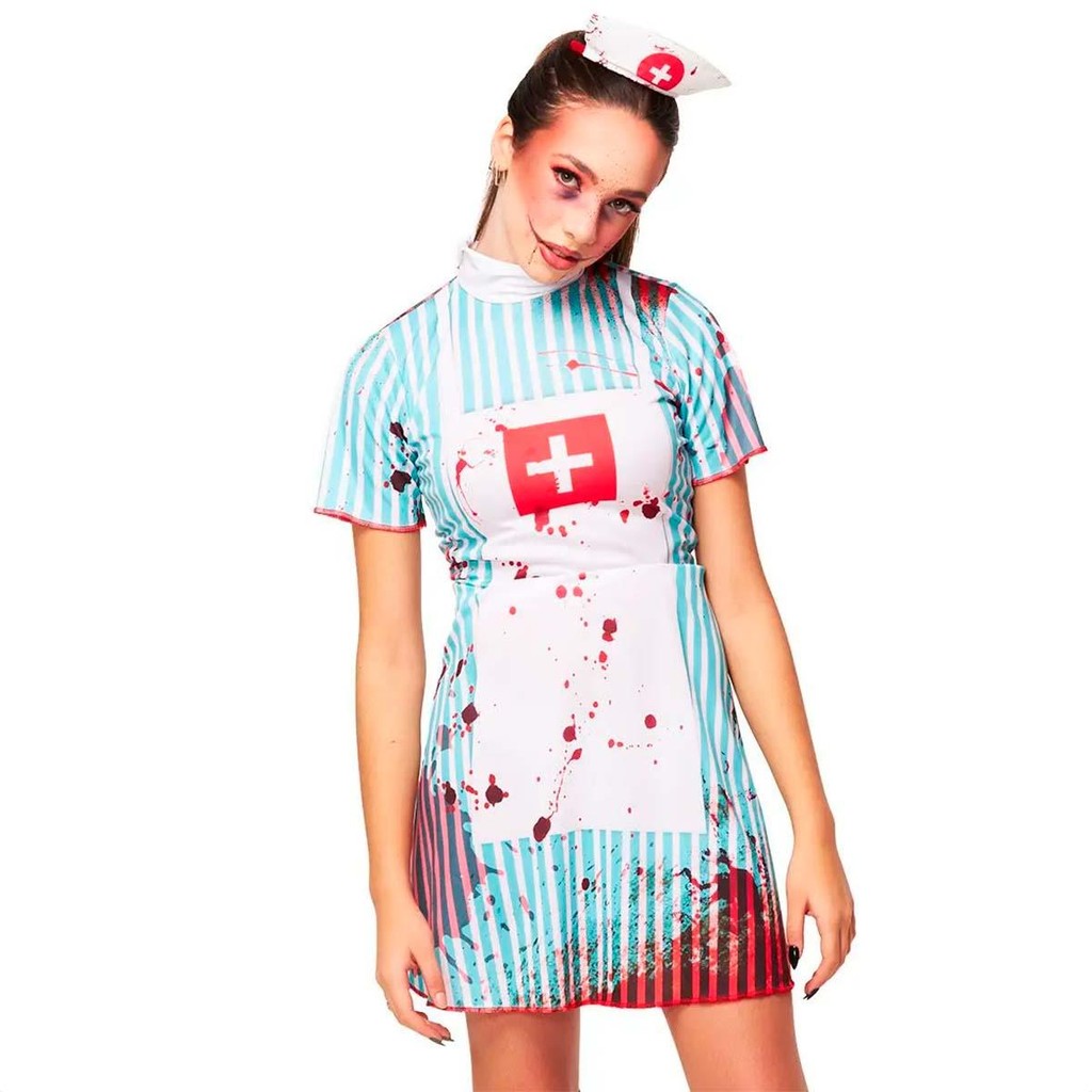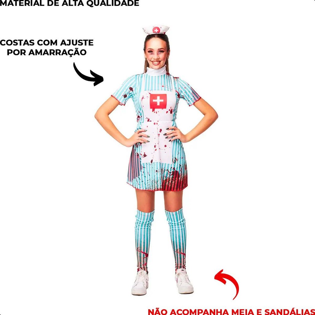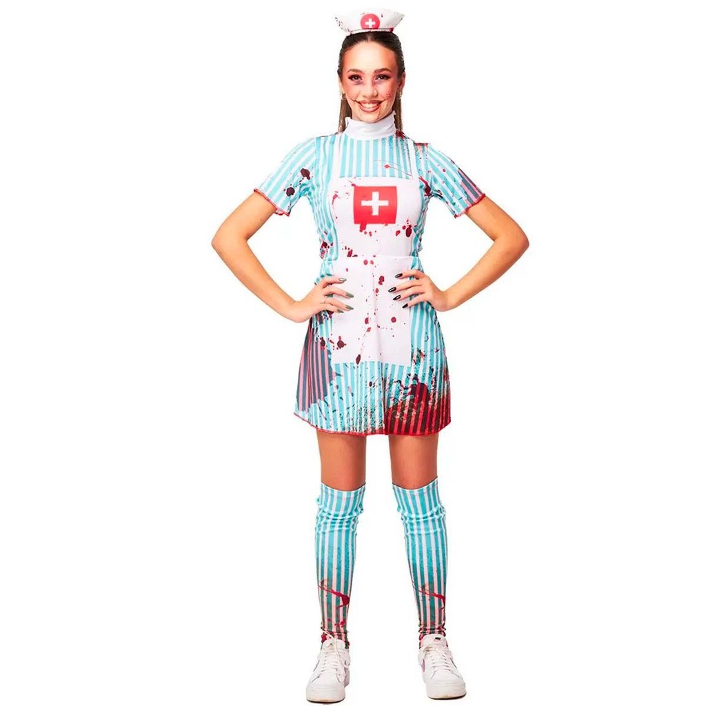 Fantasia Adulta Feminina de Halloween Roupa Enfermeira Sangrenta Completa Com Tiara e Meias