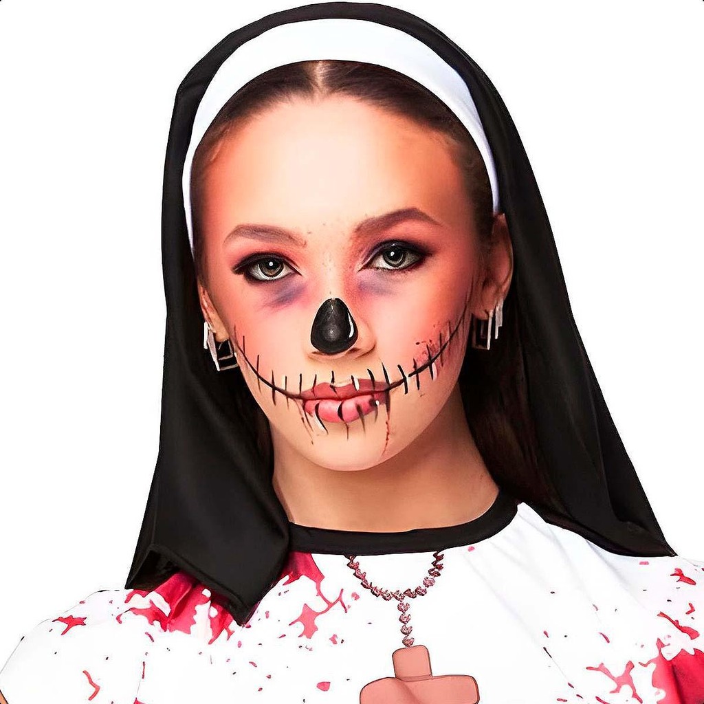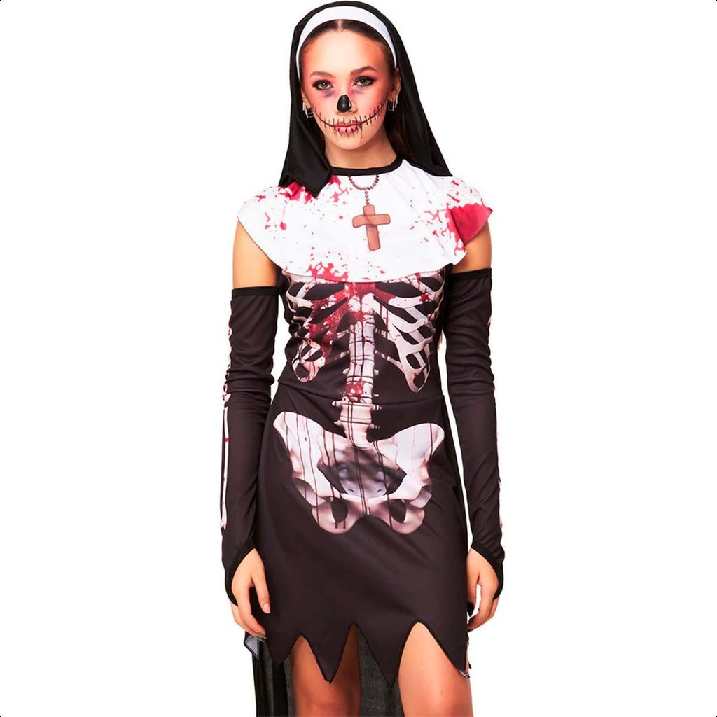 Fantasia Halloween Feminina Freira Terror Zumbi Esqueleto Com Véu de Noviça