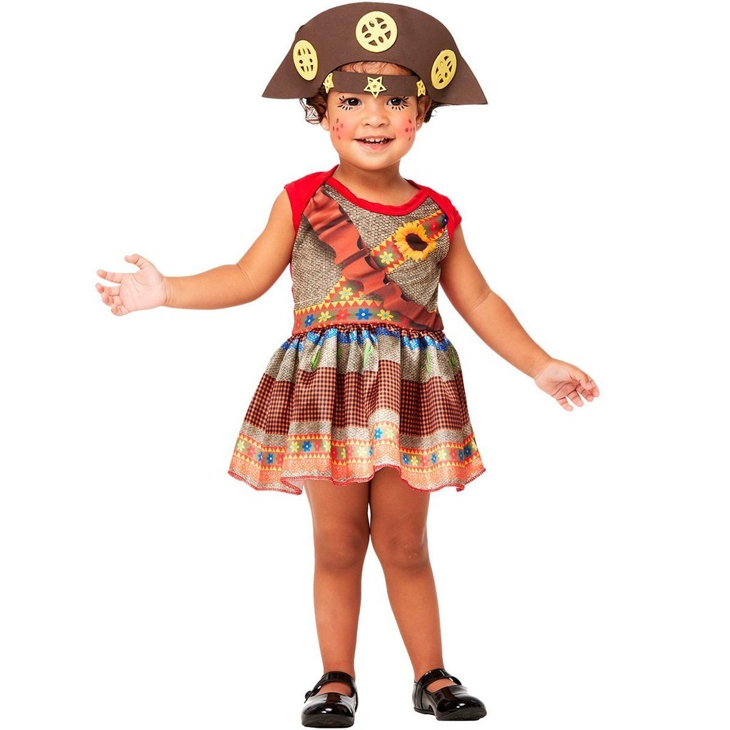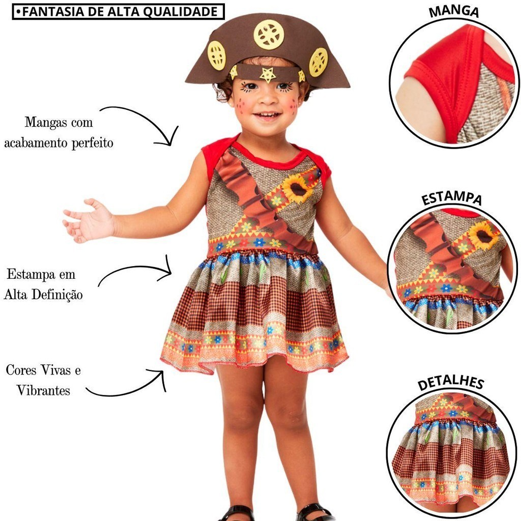 Roupa de Festa Junina Bebe Menina Fantasia Cangaceira Vestido Caipira 3 a 18 meses