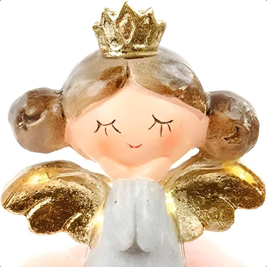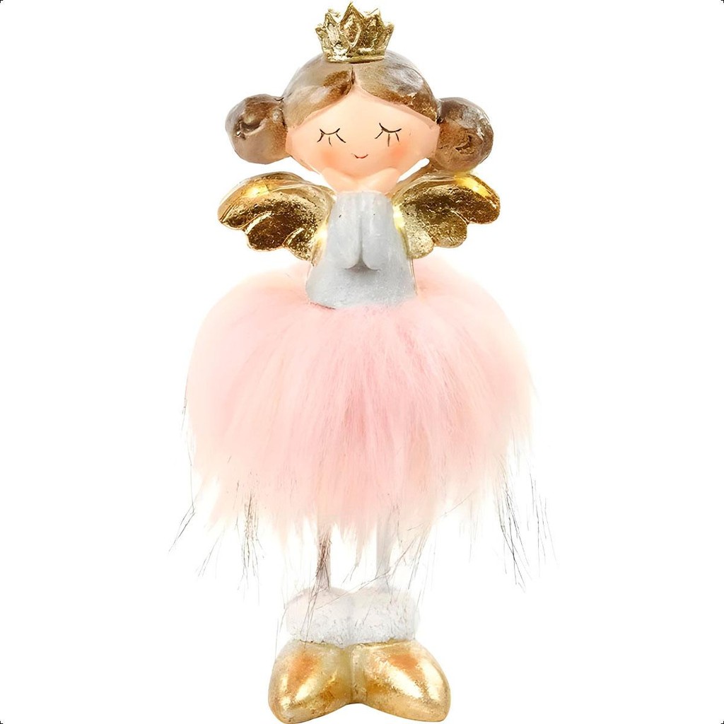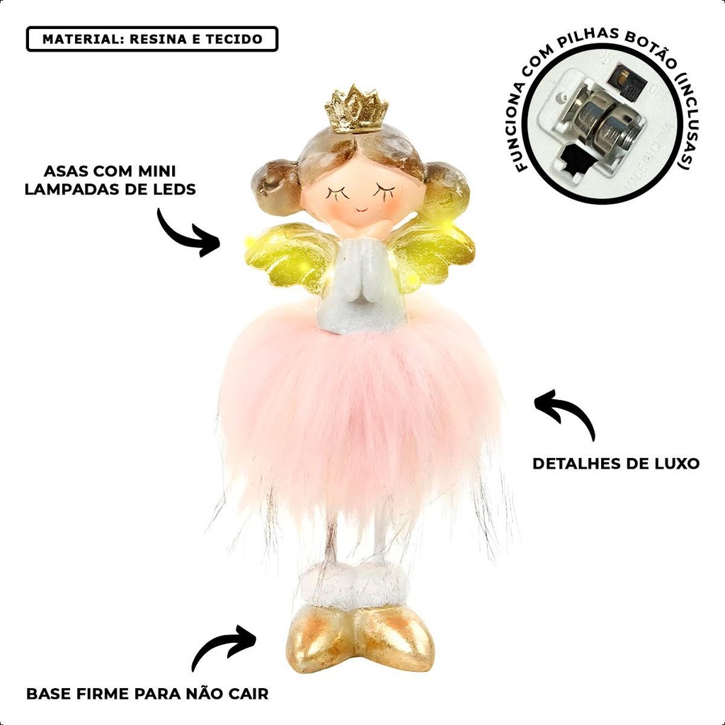 Anjo Decorativo Branco e Rosa Com Coroa e Asas Douradas com Led Mãos