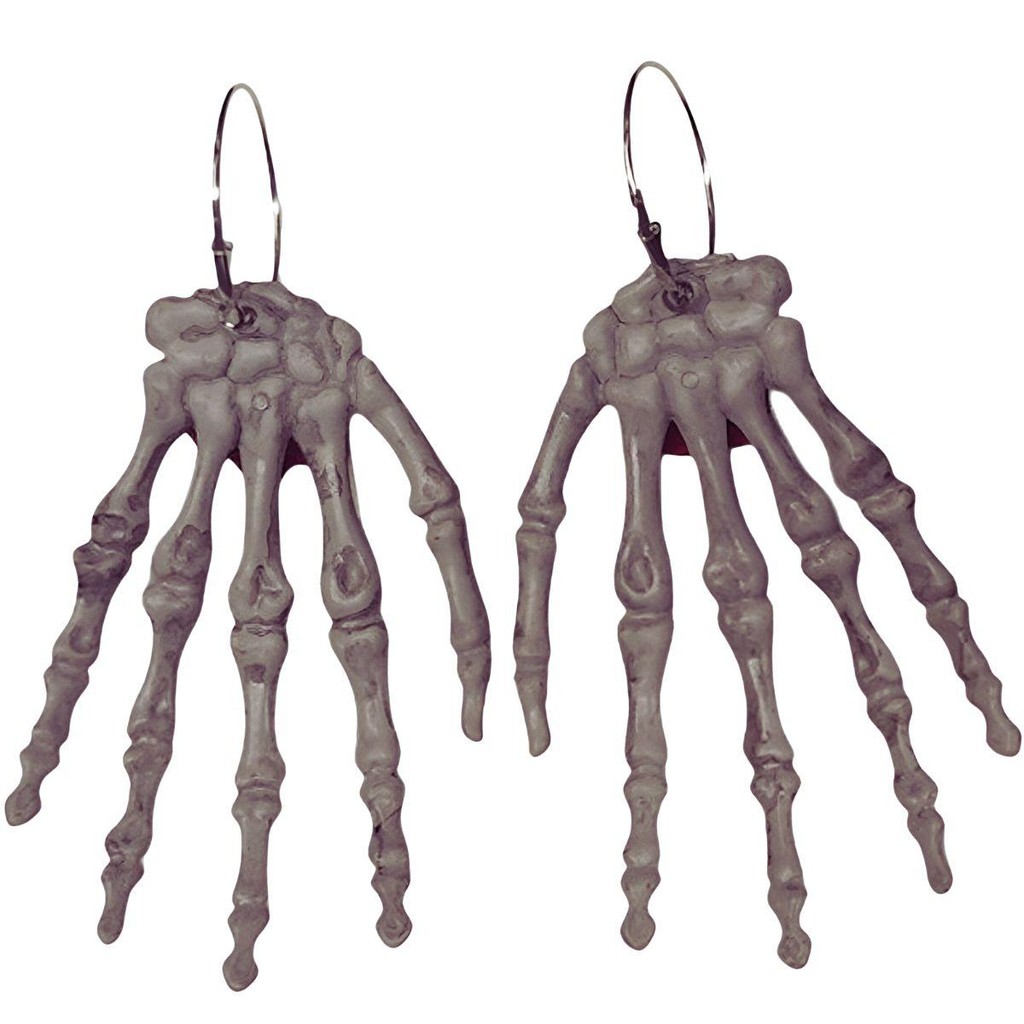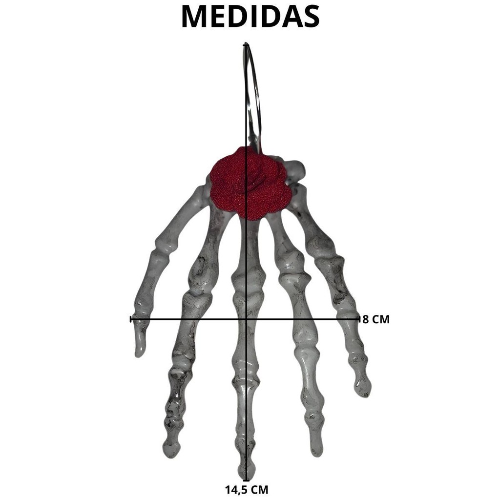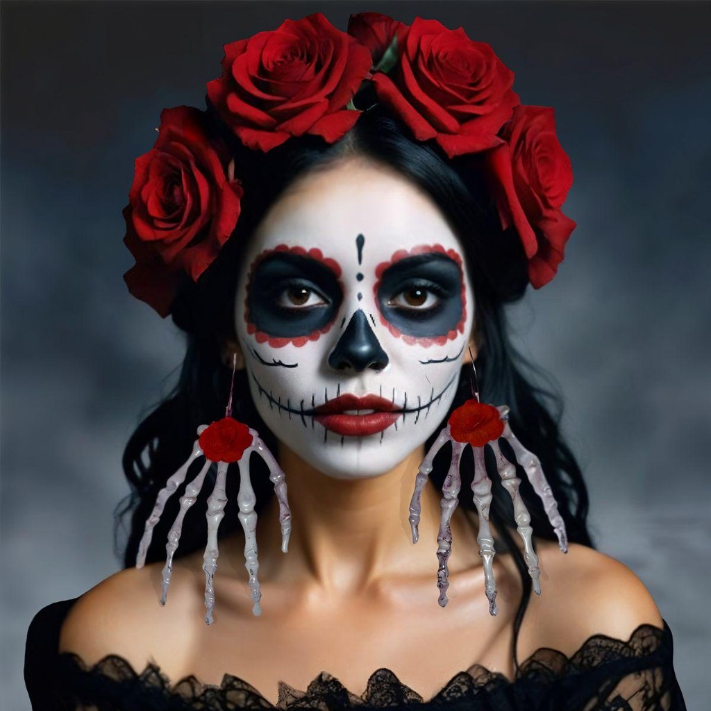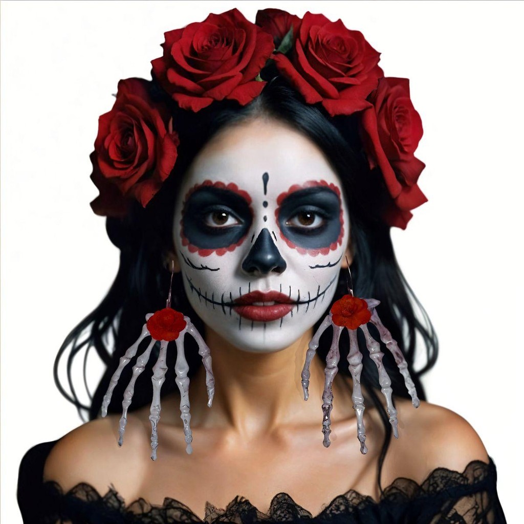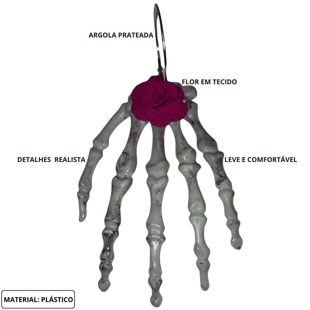 Brinco Gótico Mão de Caveira Esqueleto Com Rosa Vermelha Argola Prateada pra Fantasia Halloween Caveira Mexicana