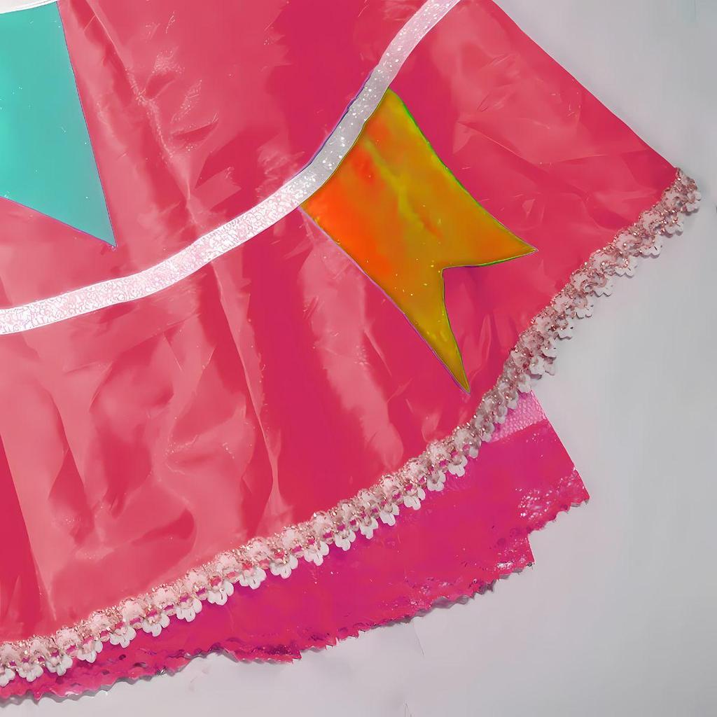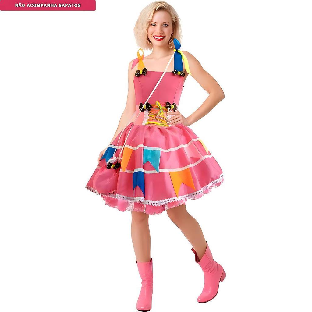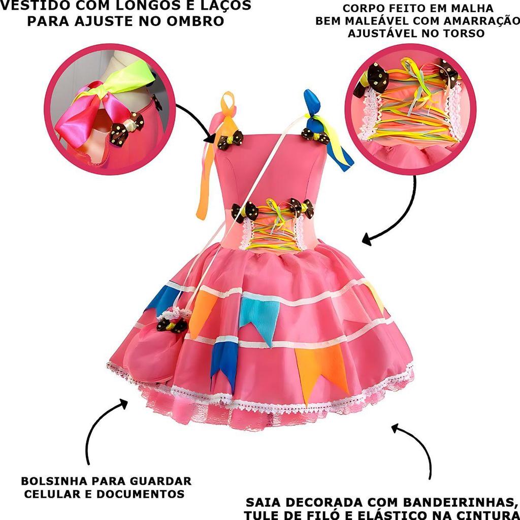 Vestido Rosa de Festa Junina pra Mulher Adulta de Luxo Rodado Com Bandeirinhas e Bolsa