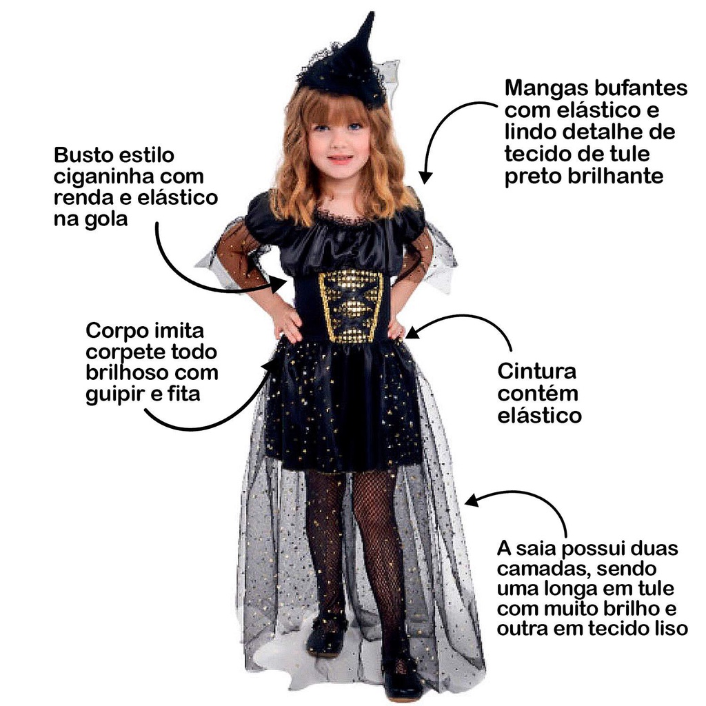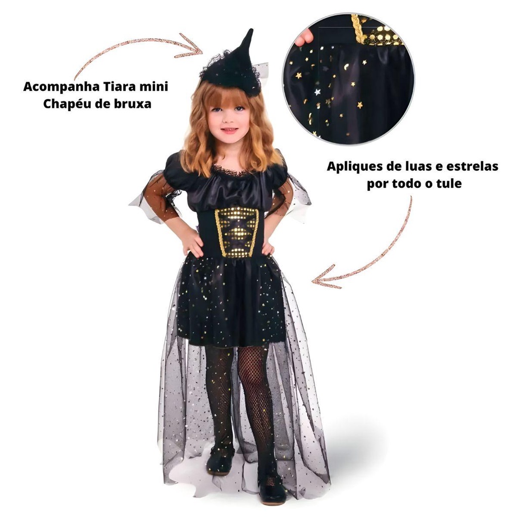 Fantasia Bruxinha de Halloween Infantil Super Luxo Com Chapeu