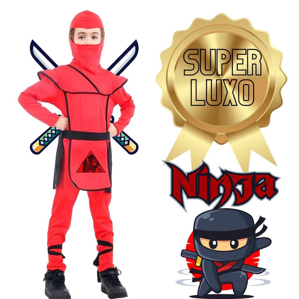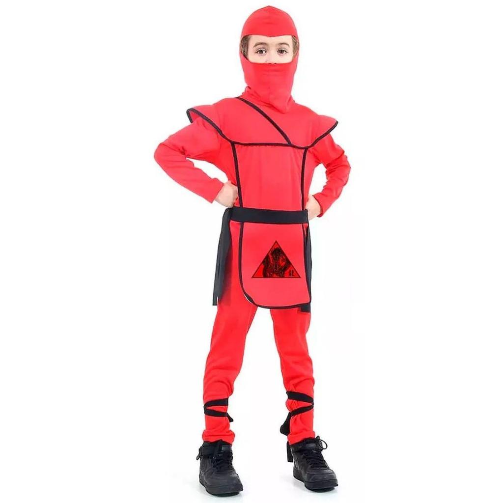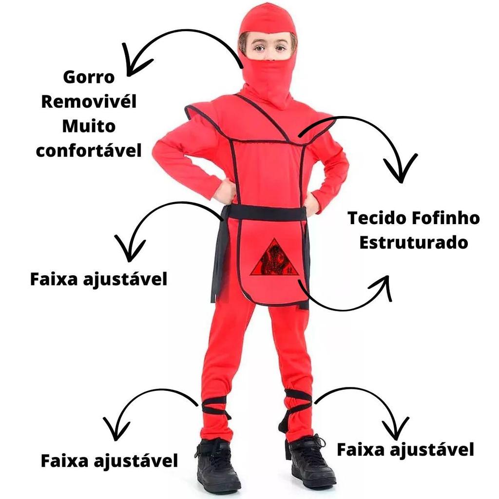 Fantasia Ninja Infantil Samurai Vermelho de Luxo Com Gorro