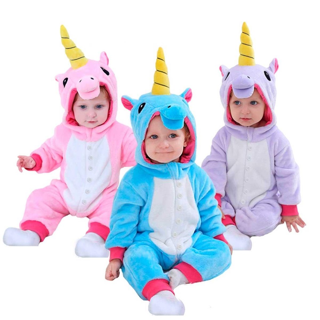 Kigurumi Bebê Menina ou Menino de Unicornio Fantasia Pijama de Inverno Quentinho com Capuz Bordado Rosa Azul ou Roxo
