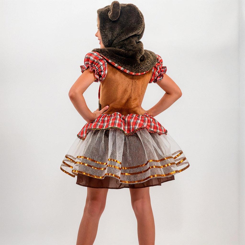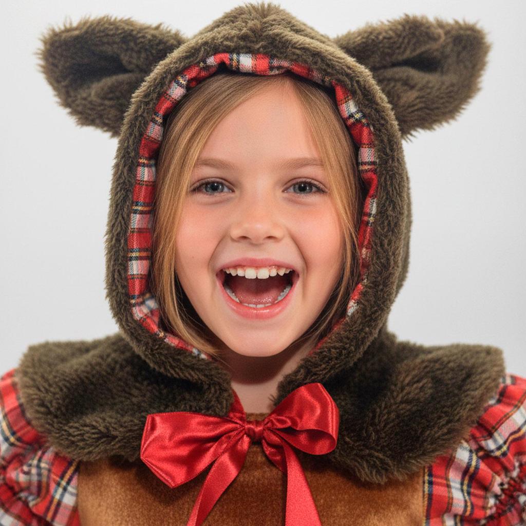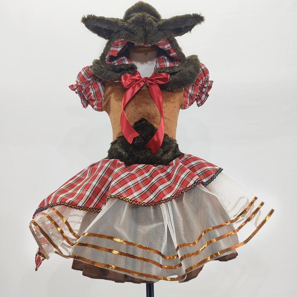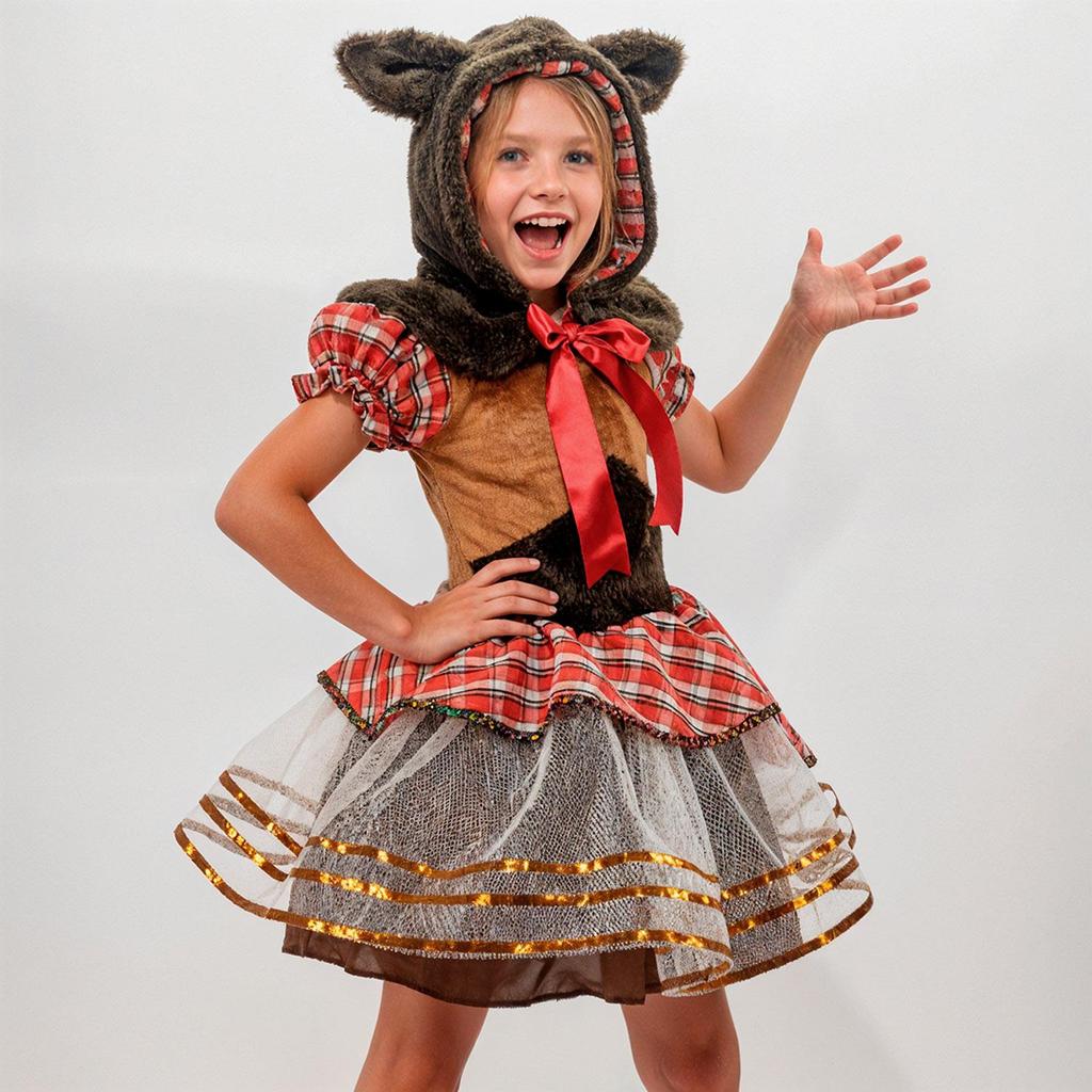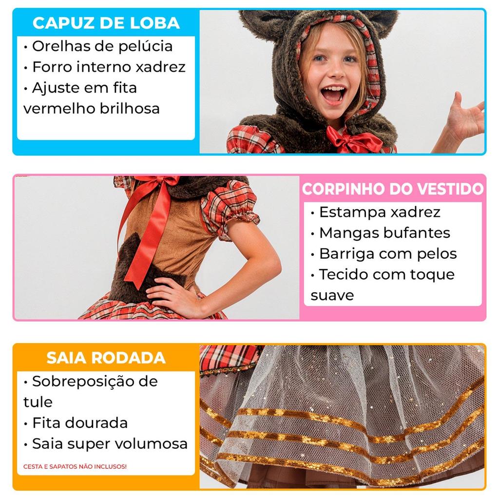 Fantasia Infantil Feminina de Lobinha Lobo de Luxo com Vestido Xadrez Rodado e Capuz com Pelinhos