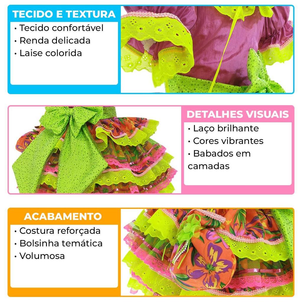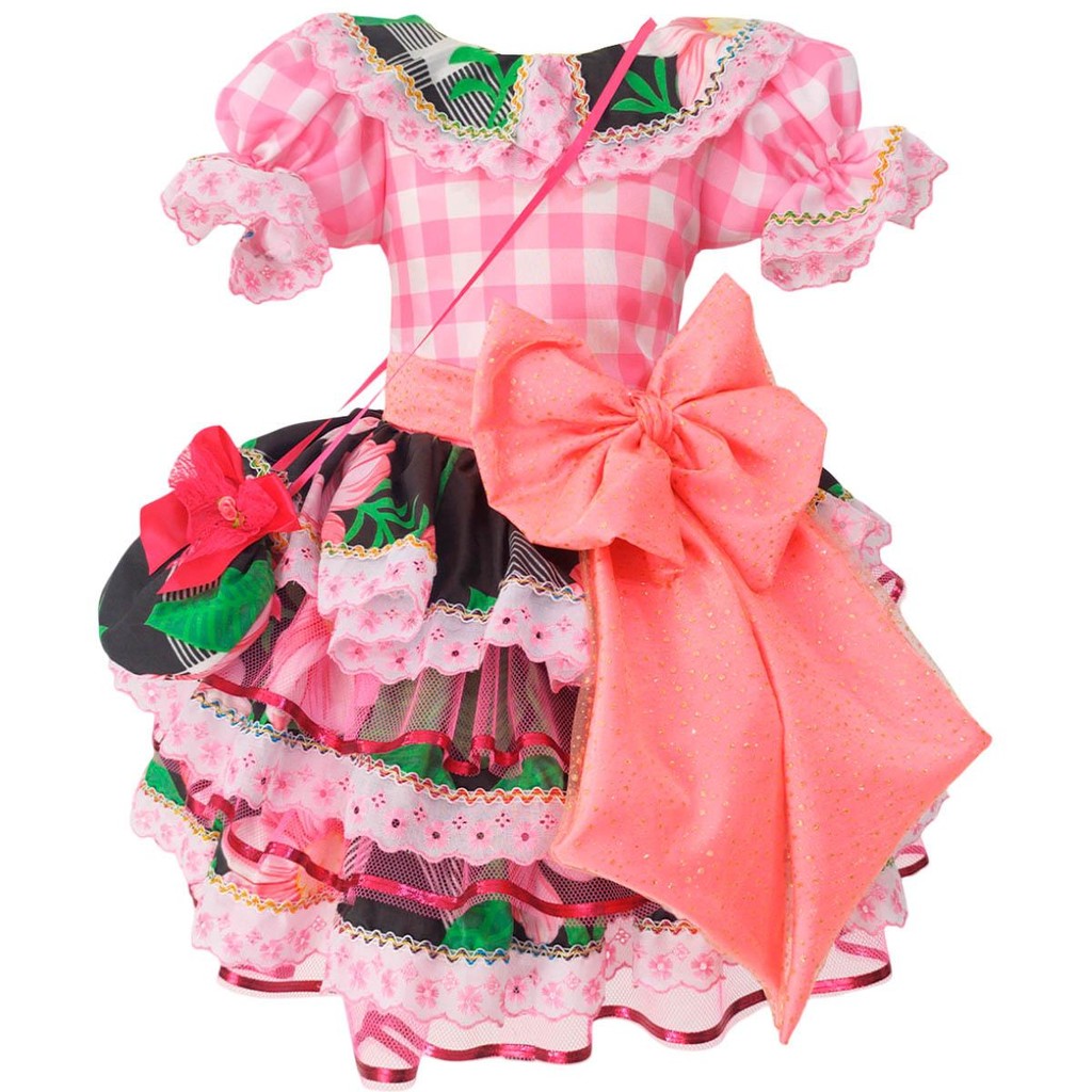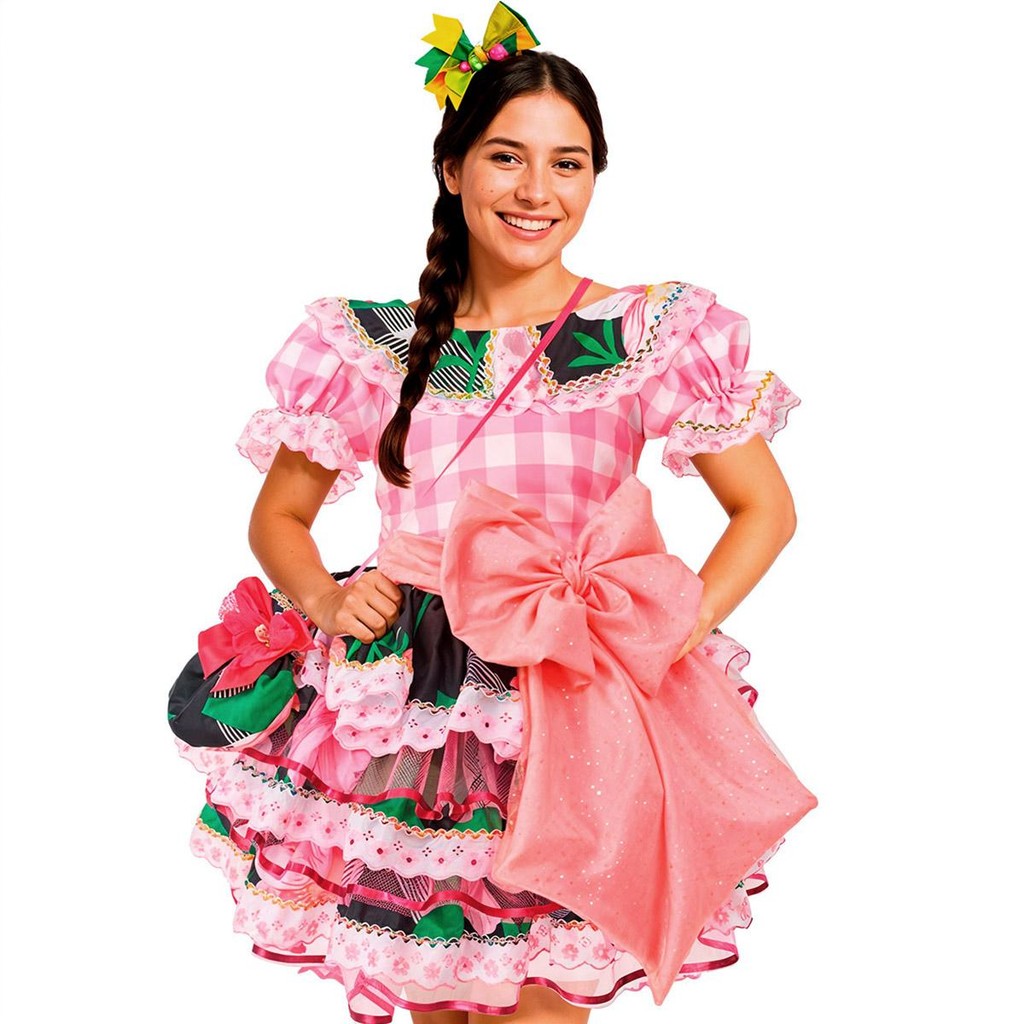 Vestido Festa Junina Adulto Feminino de Luxo Super Rodado Com Bolsa Preto e Rosa