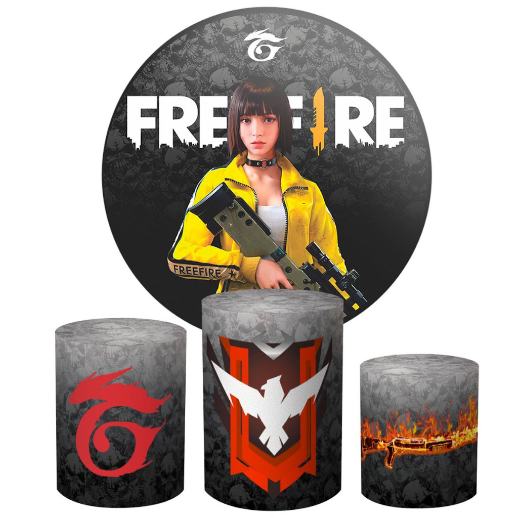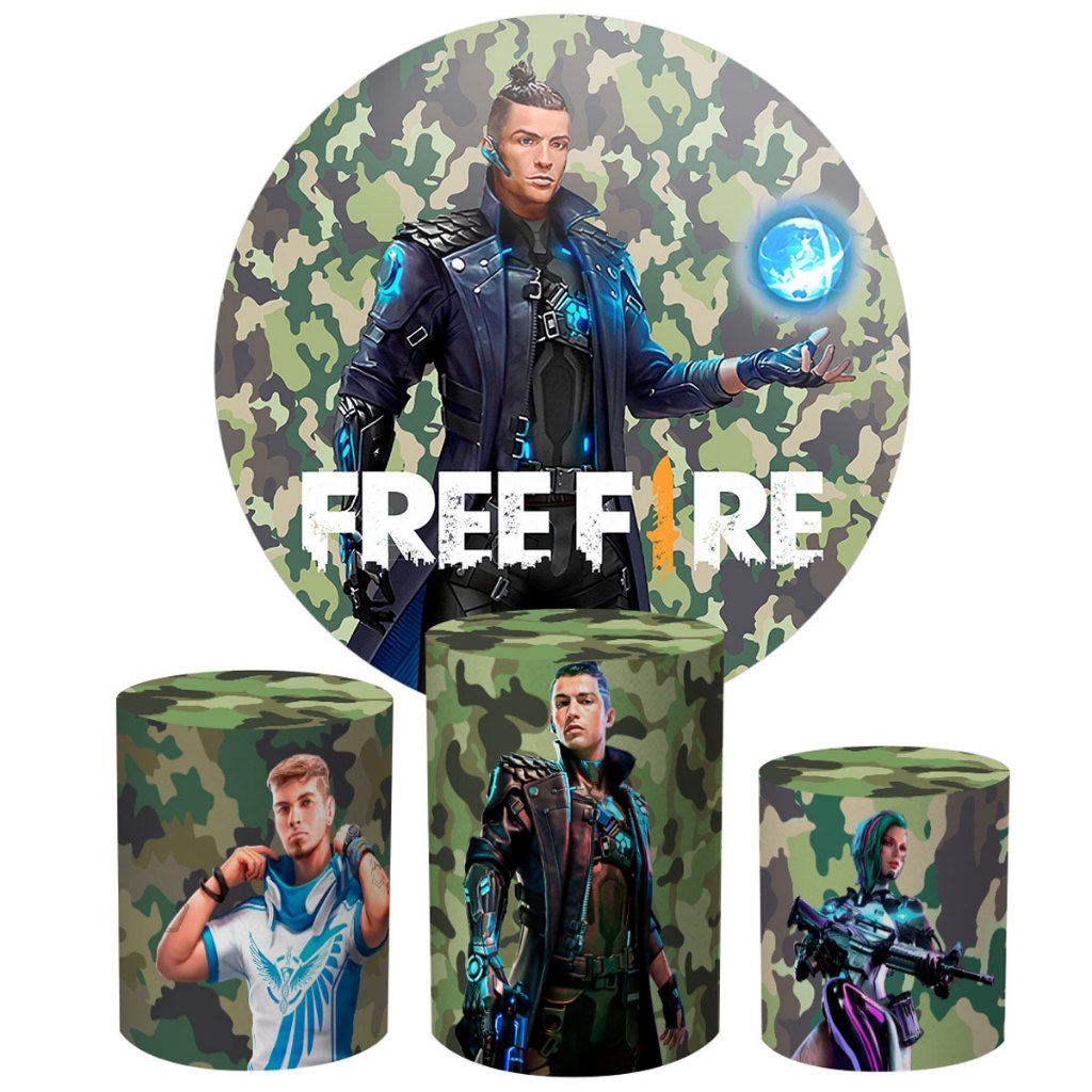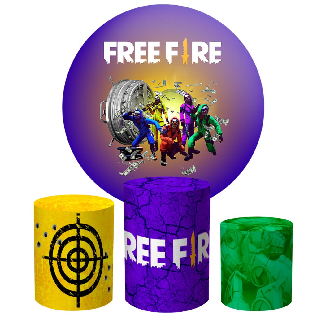 Kit Painel Redondo Free Fire 1.50x1.50 + Trio Capas de Cilindro Decoração de Aniversário de Menino