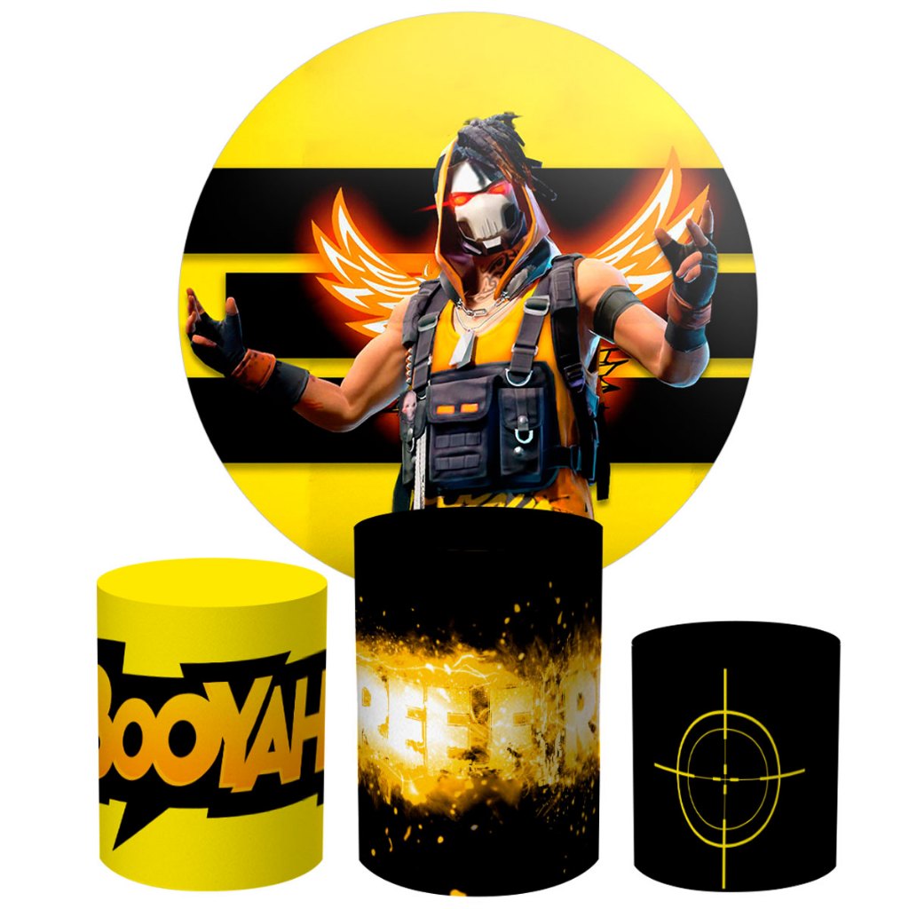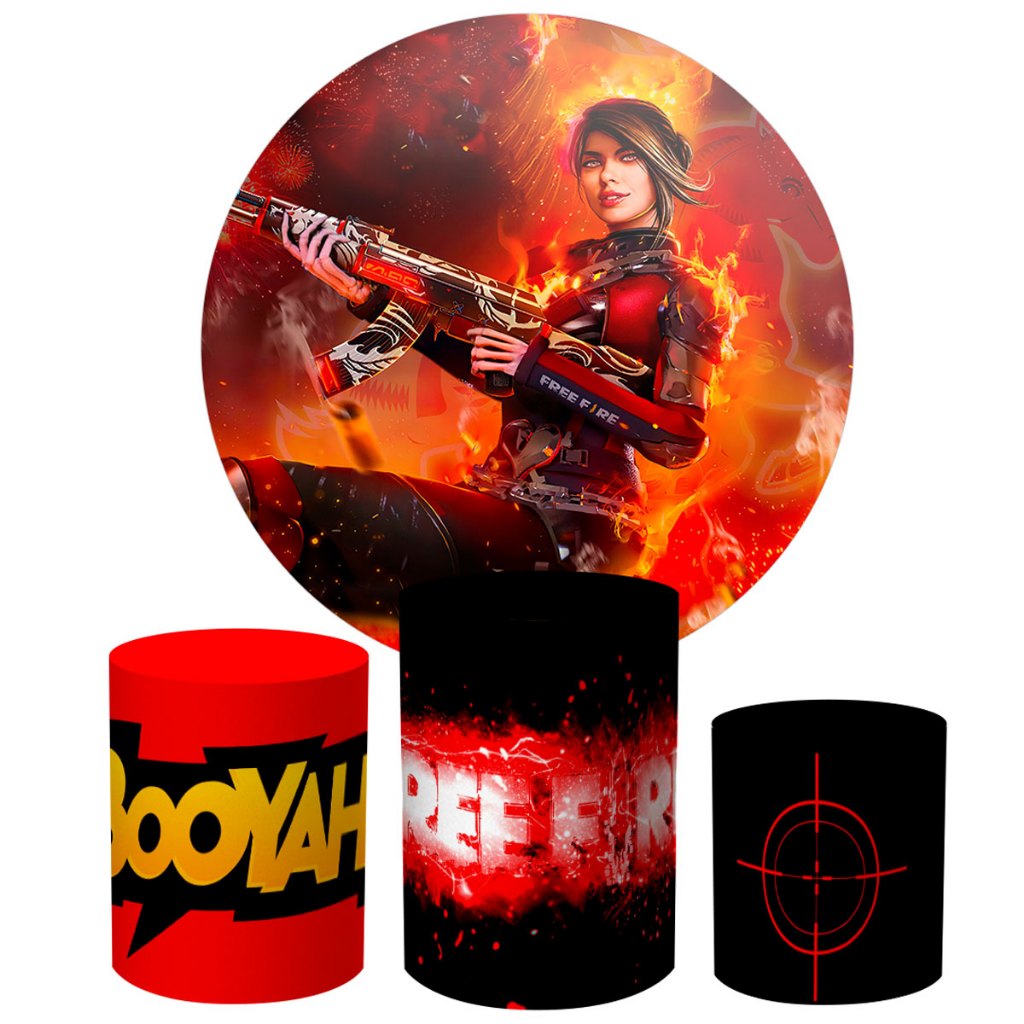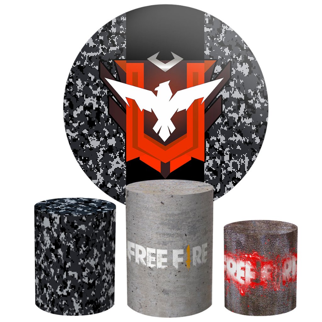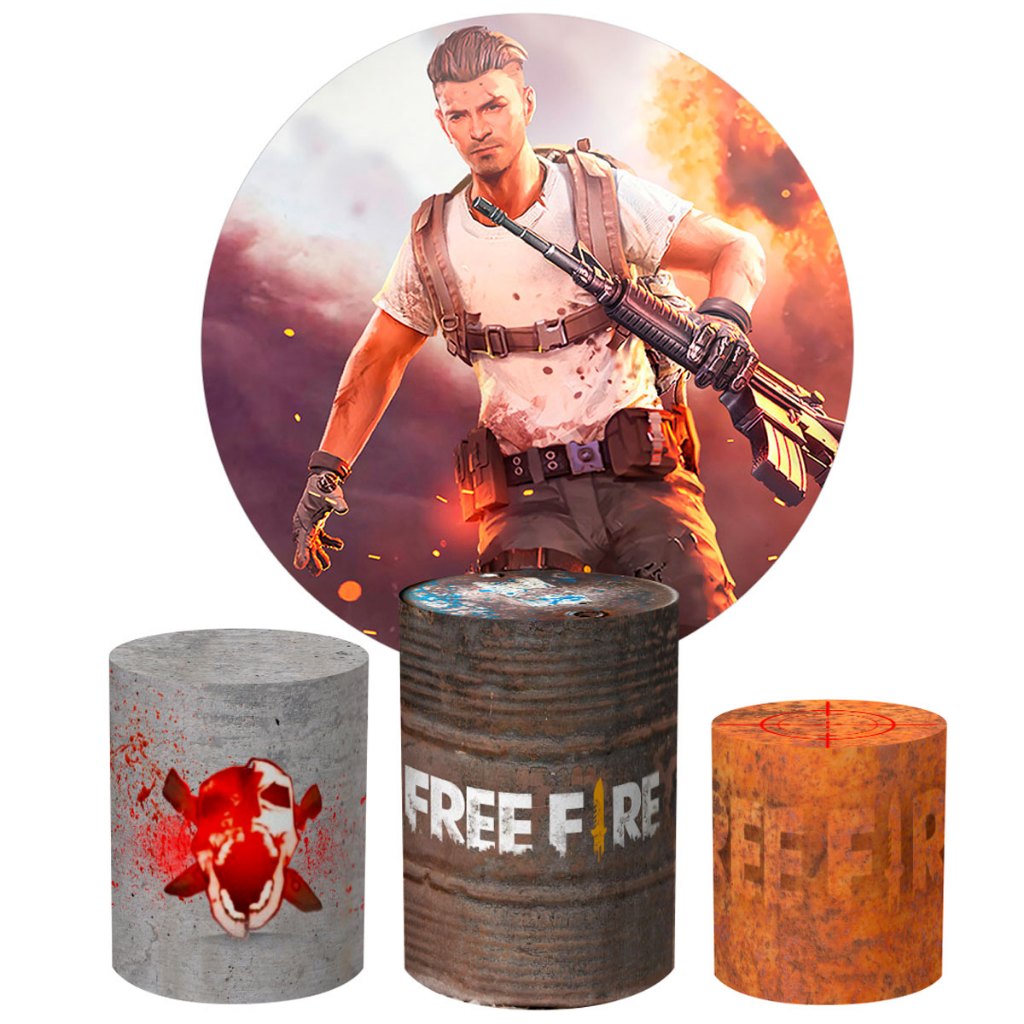 Kit Painel Redondo Free Fire 1.50x1.50 + Trio Capas de Cilindro Decoração de Aniversário de Menino