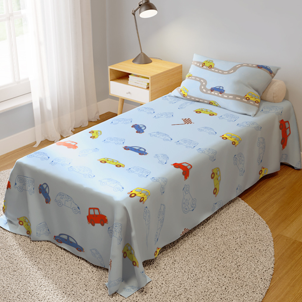 Kit Jogo de Lençol Infantil Baby Carrinhos Cobre Leito + Fronha Quarto Decorado Para Meninos