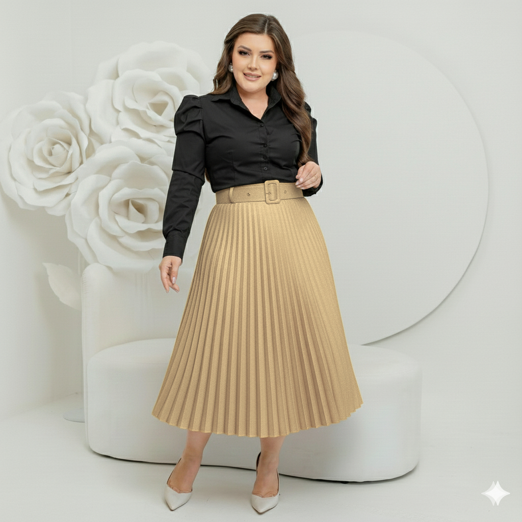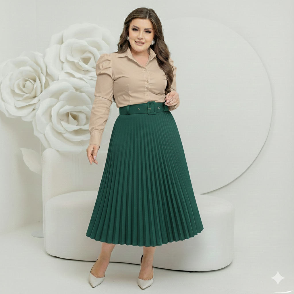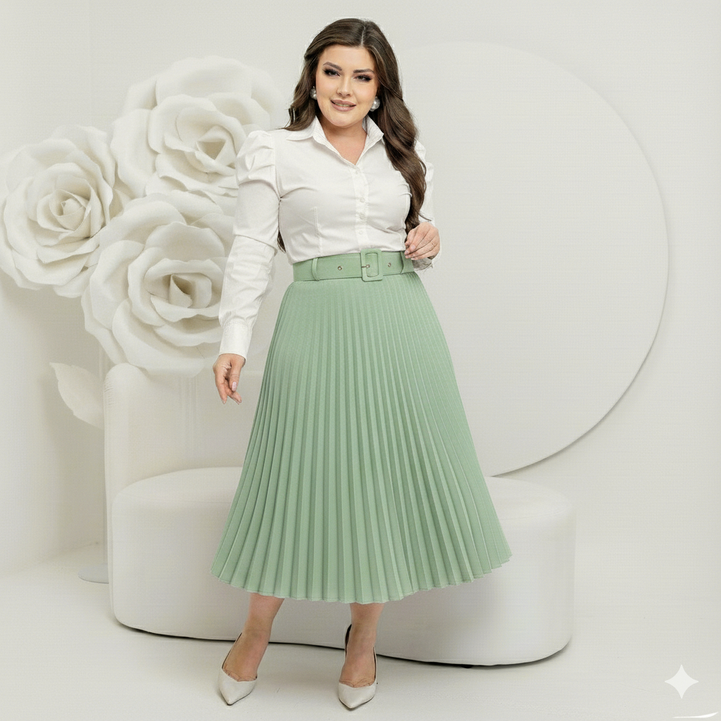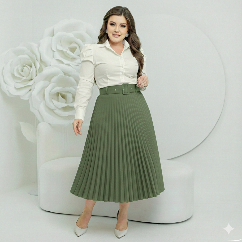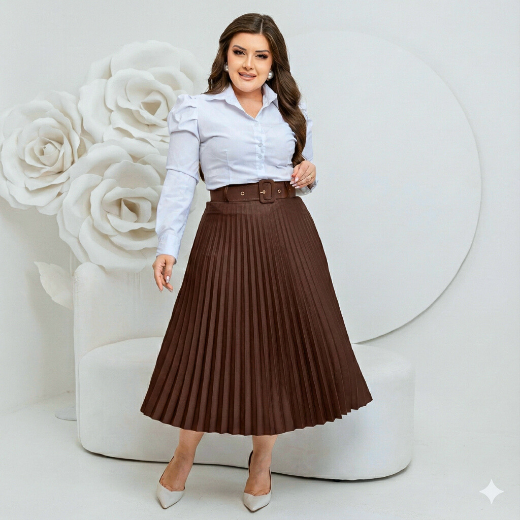 Saia Midi Plissado Com Cinto Forrada estilosa Tendencia moda evangelica