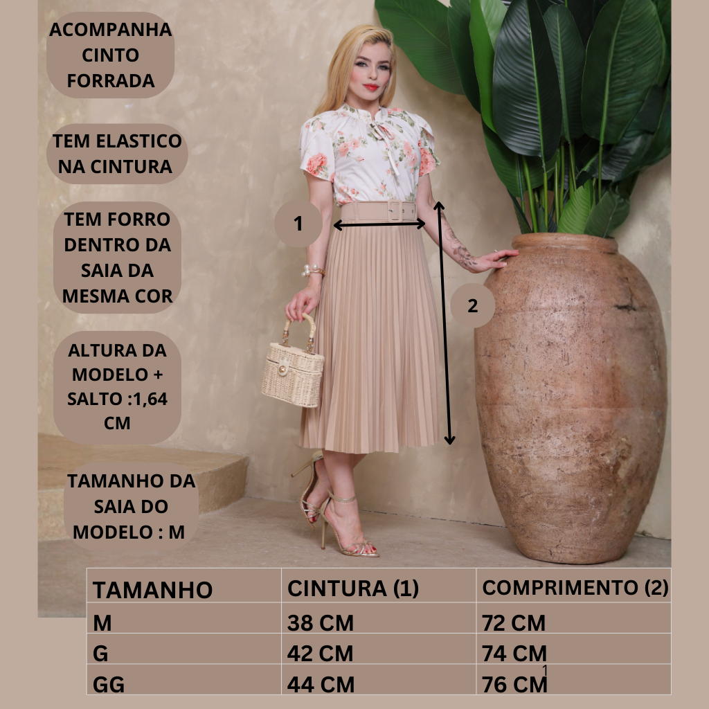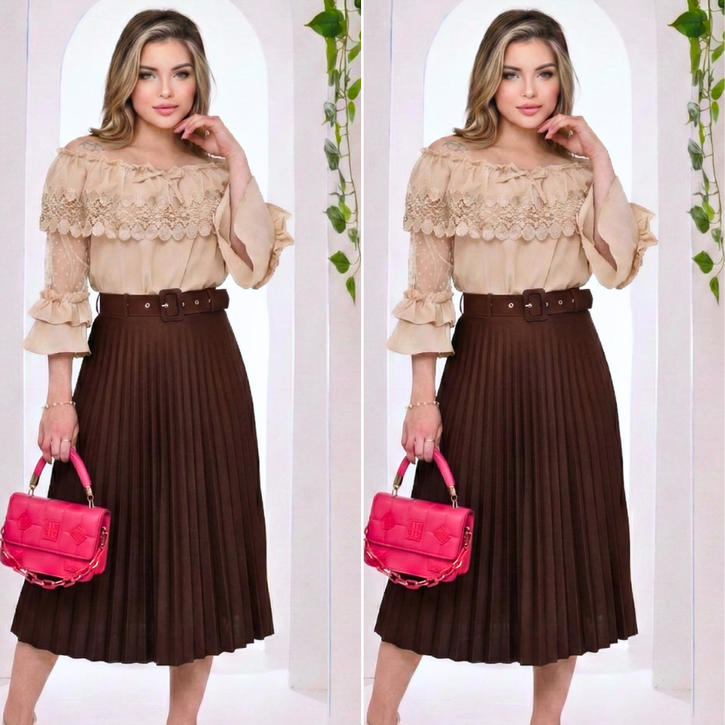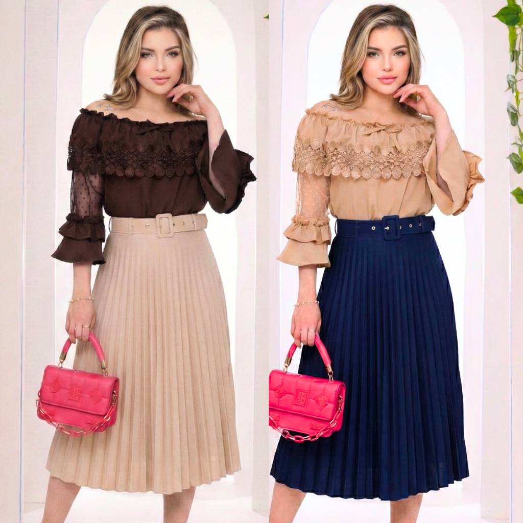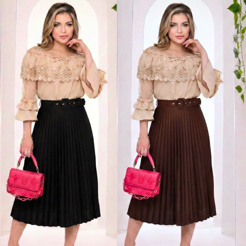 kit 2 Saia Plissada Midi Com Cinto Luxo Moda Evangélica Social Executiva Não Fica Transparente