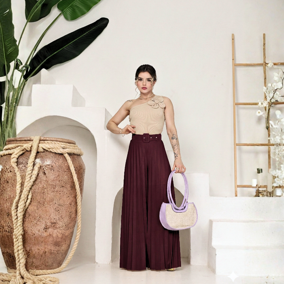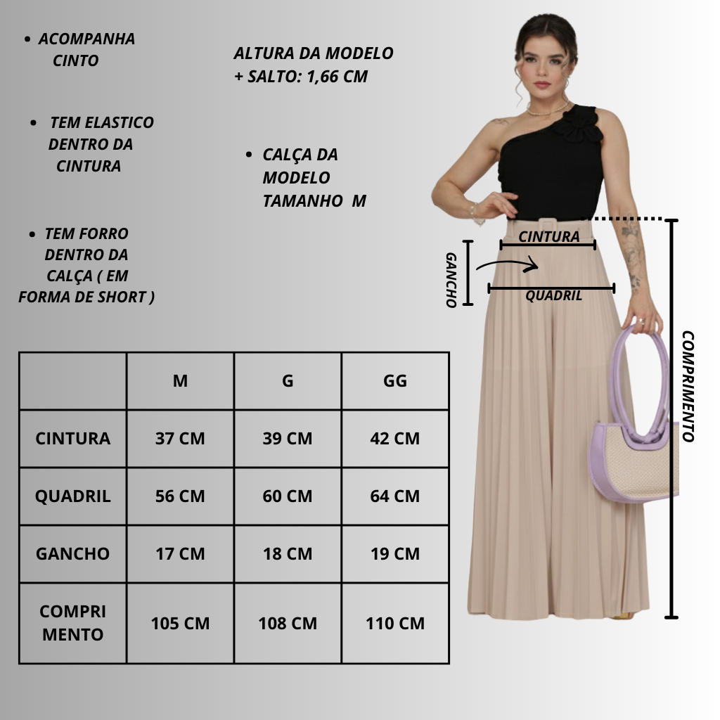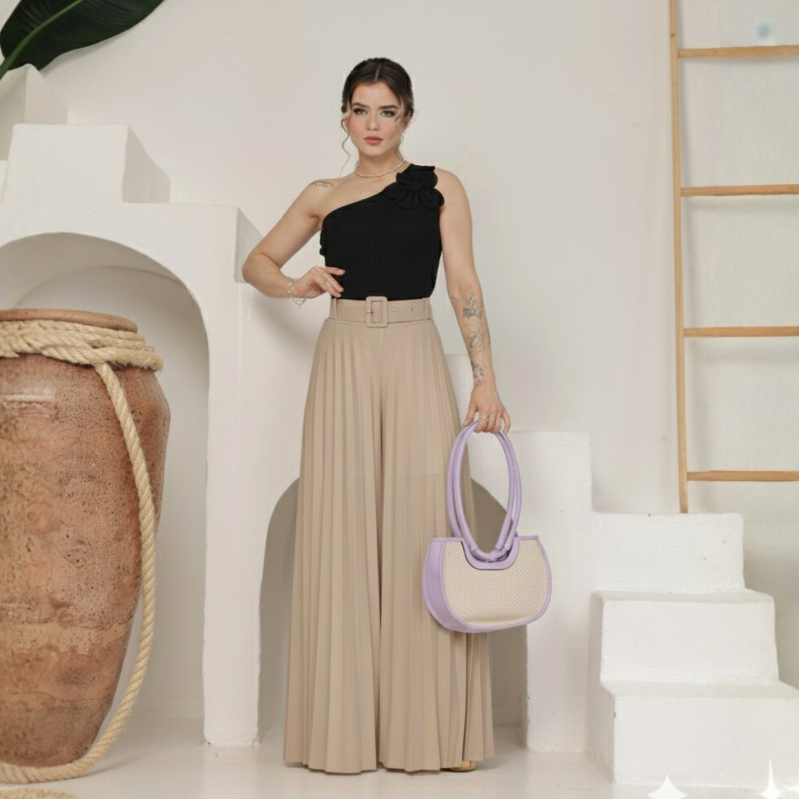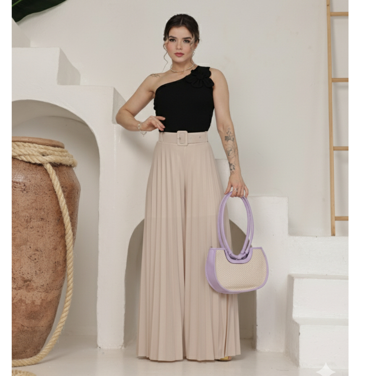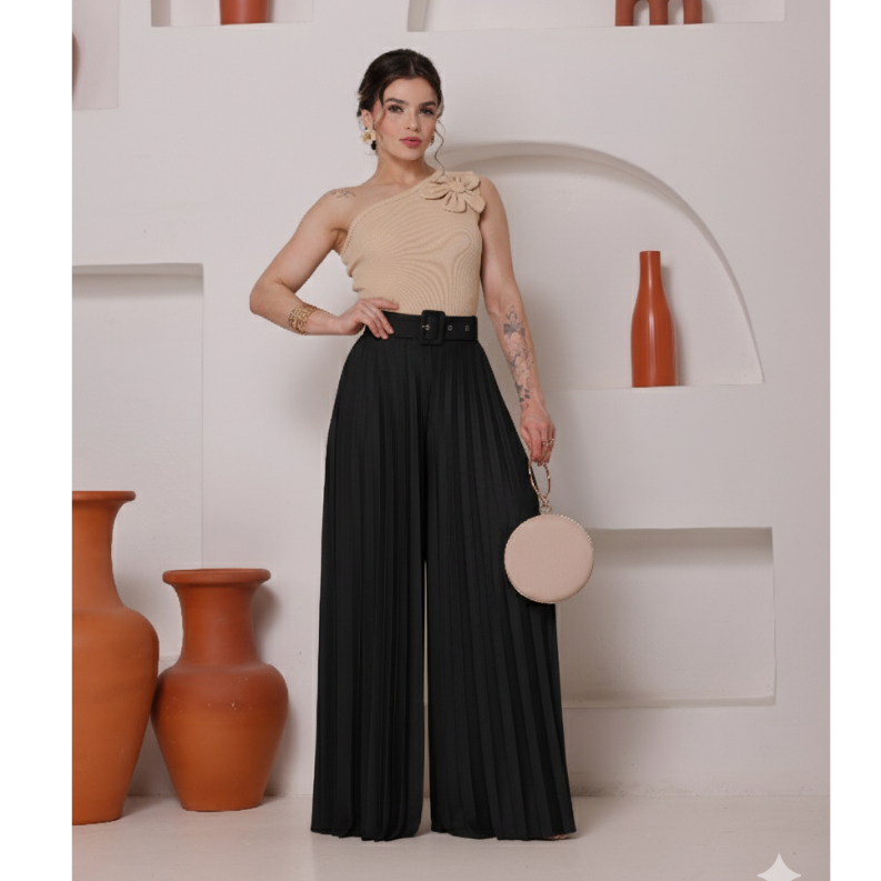 Calça Plissada Feminina Pantalona com Cinto Elegante Cintura Alta Social Festa