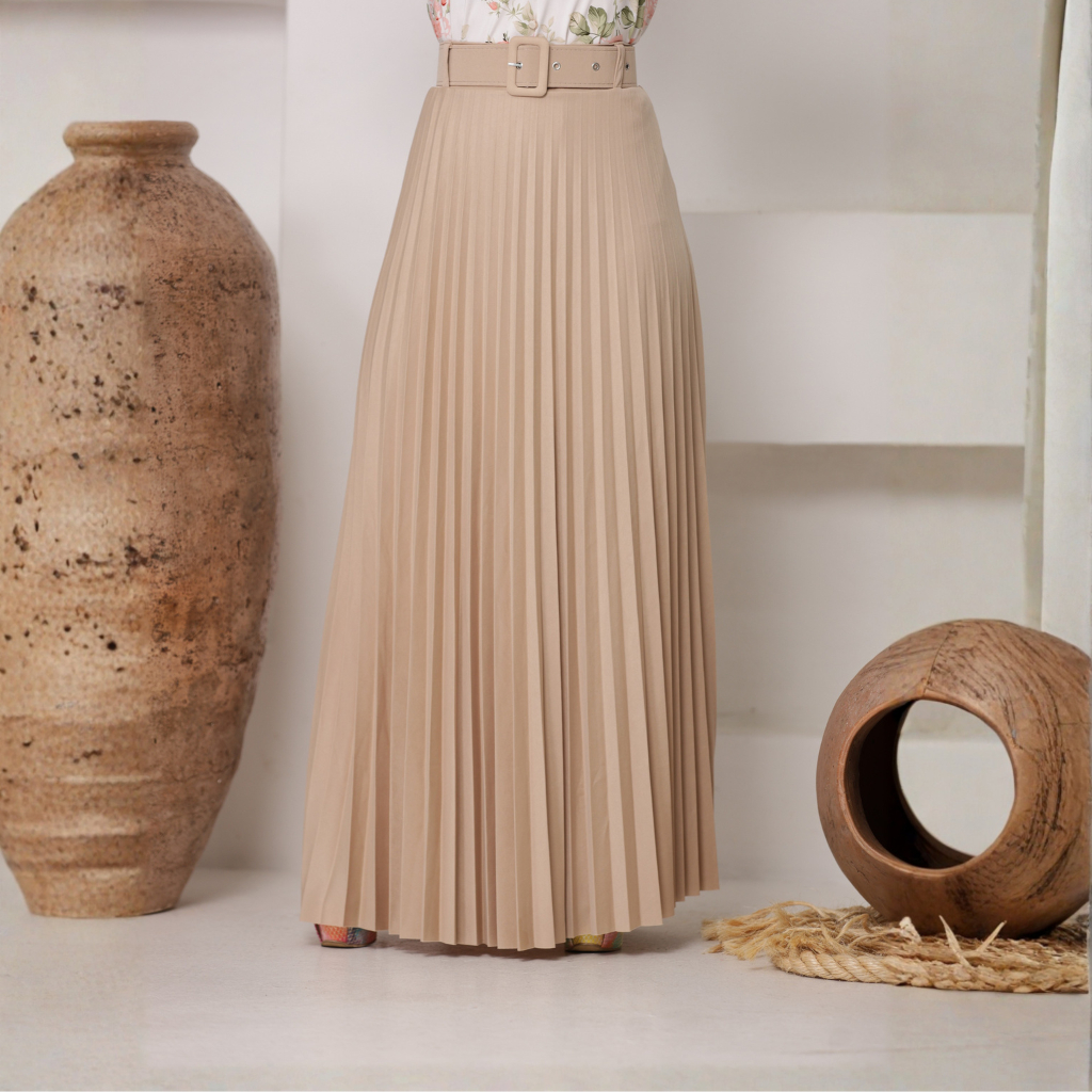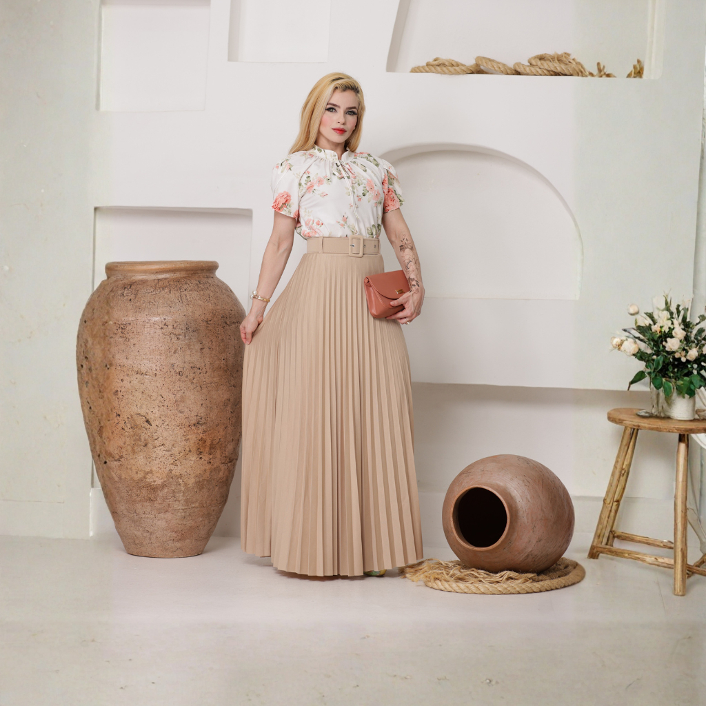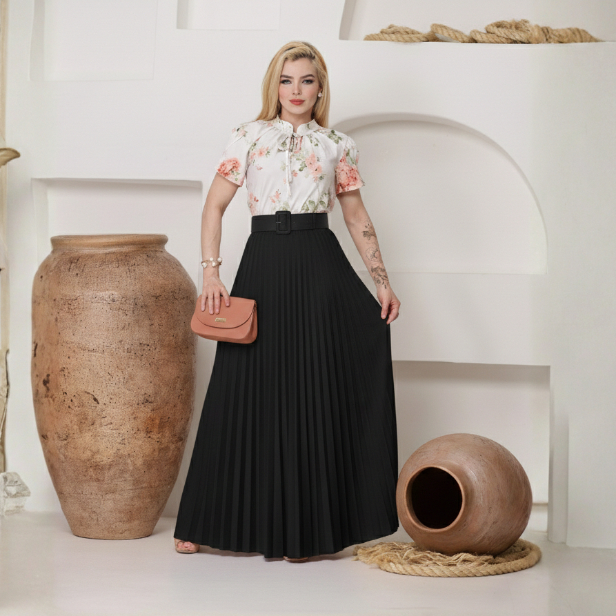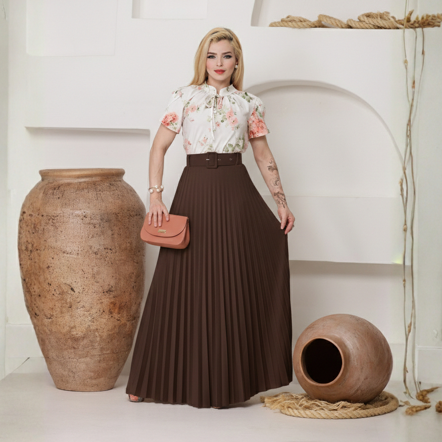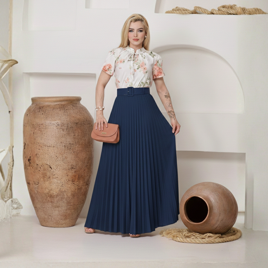 Saia Plissada Longa Feminina Elegante Cintura Alta Moda Evangélica Tendência Premium Luxo