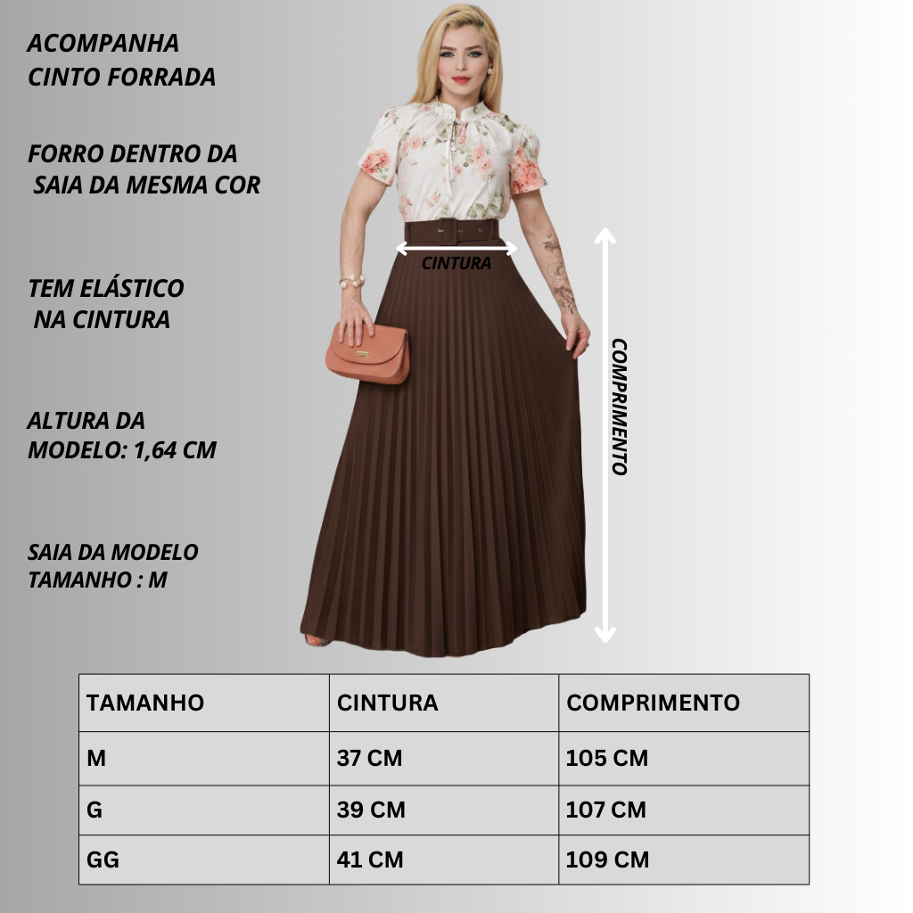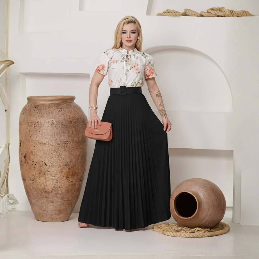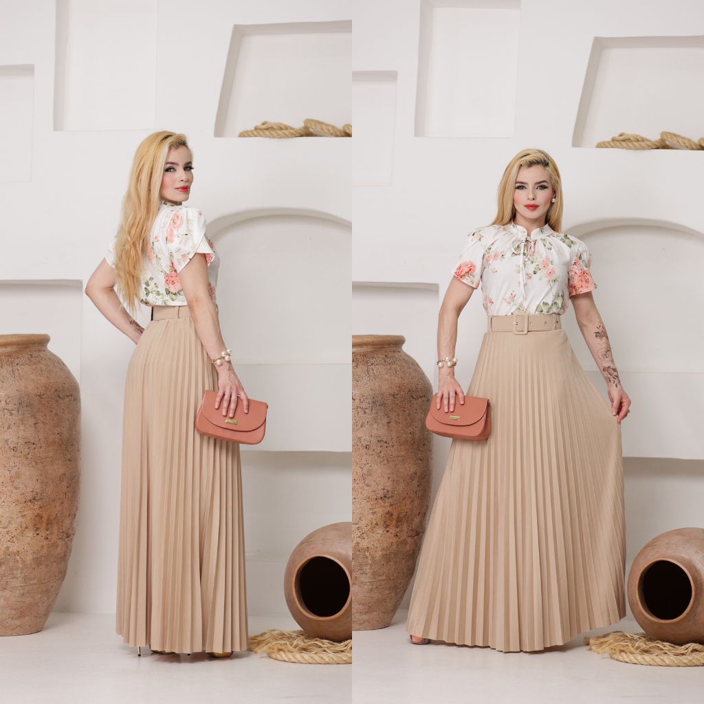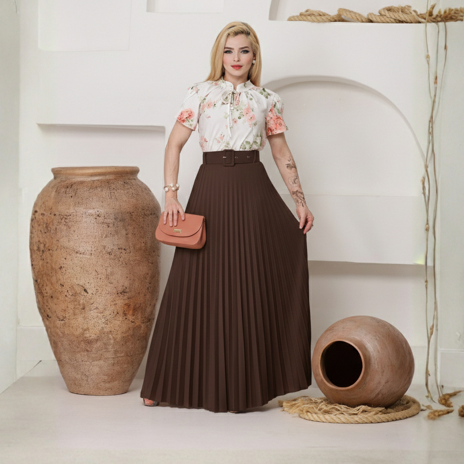 Saia Plissada Longa Feminina com cinto Moda Evangélica Casual Festa Trabalho Cintura Alta