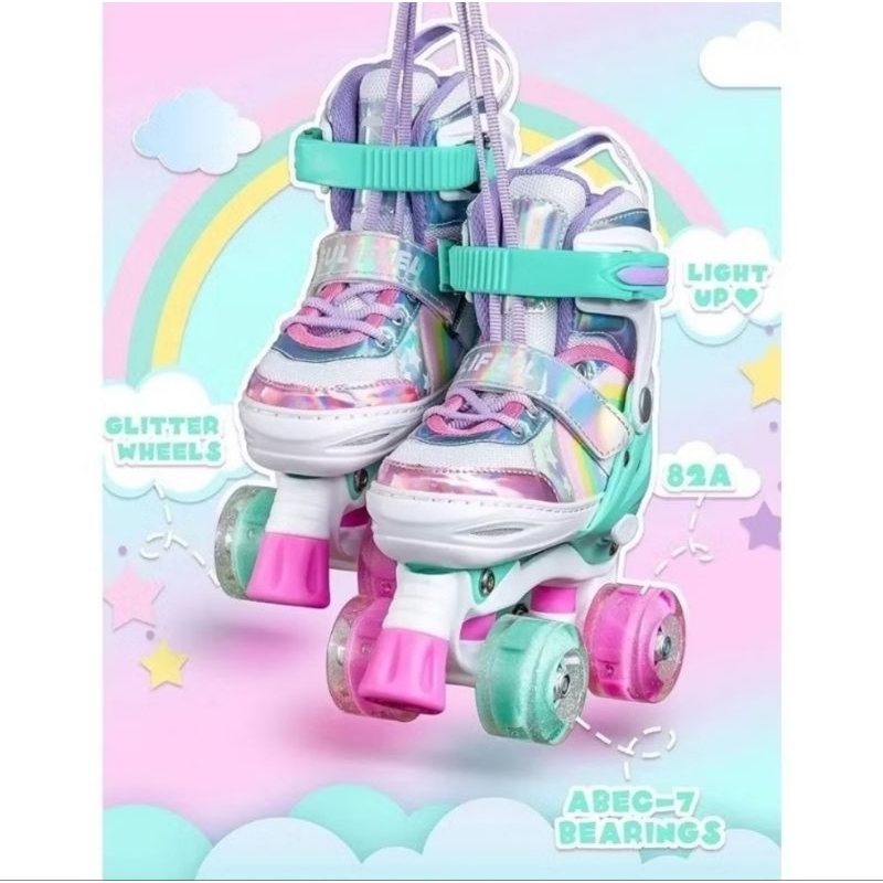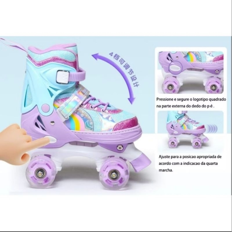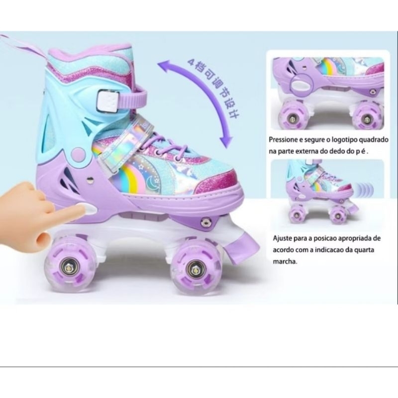 Patins Infantil 4 Rodas Menina ARCO IRIS Com Luz De Led Patins COM /SEM Kit Proteção