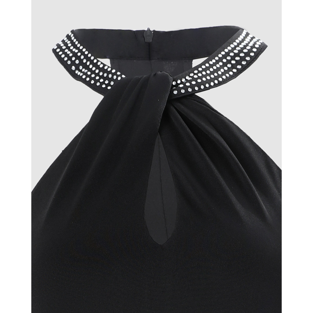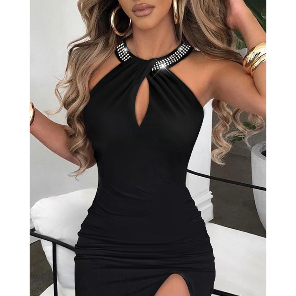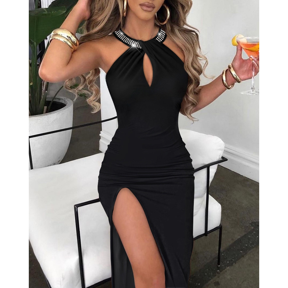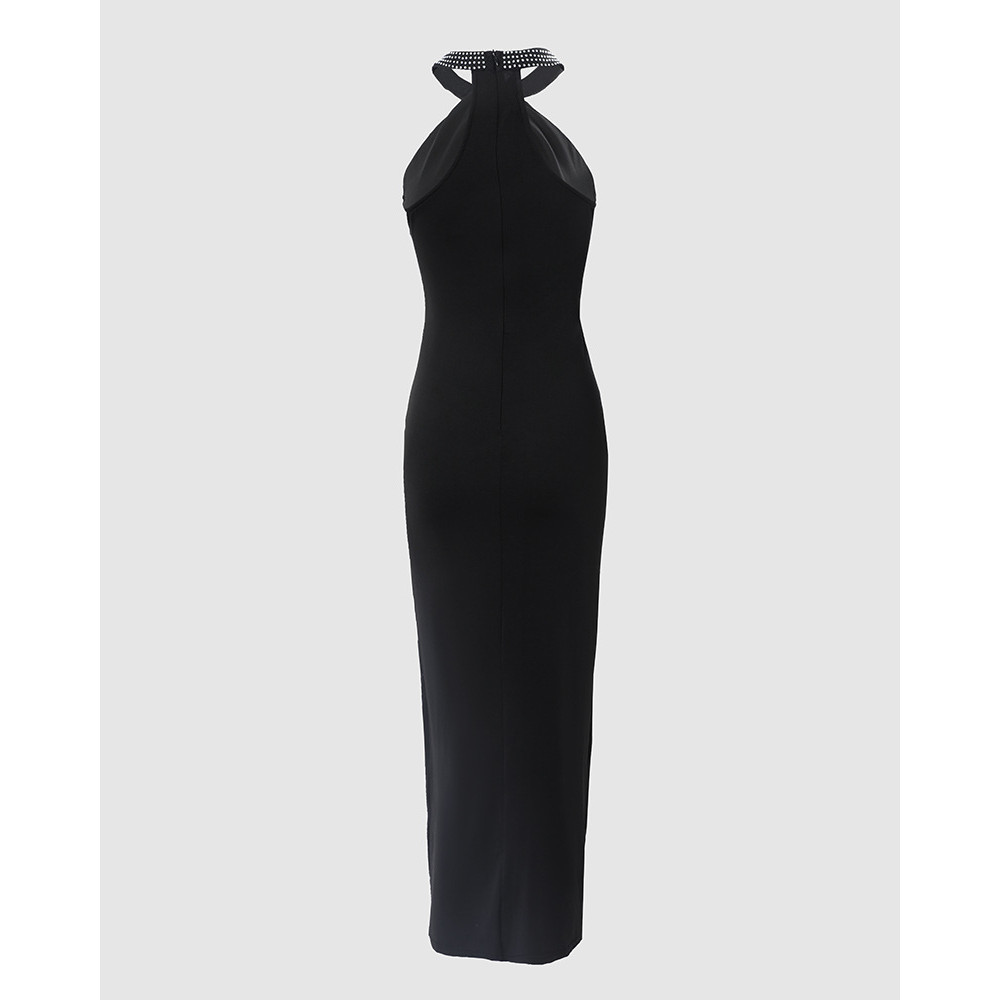 2025 moda transfronteiriça Halterneck vestido de strass quente independente em pé elegante sem mangas saia com fenda