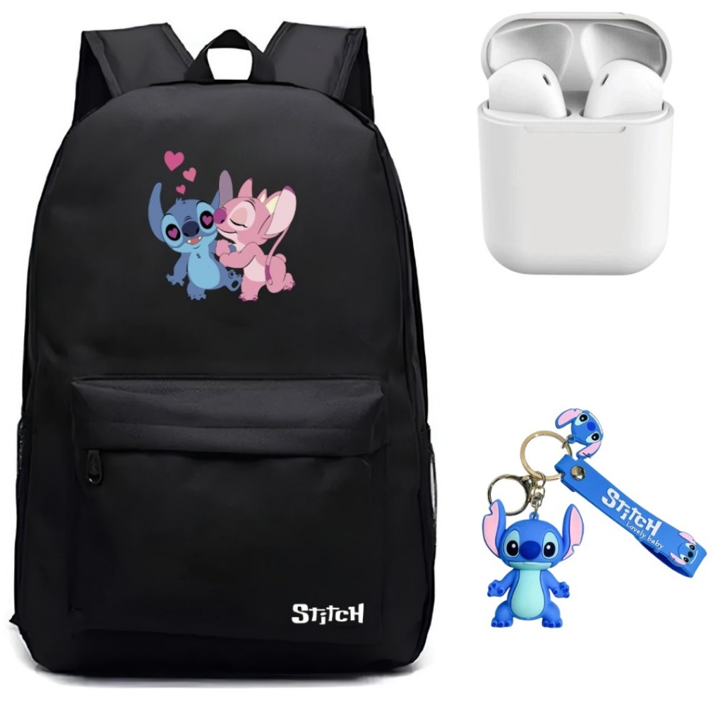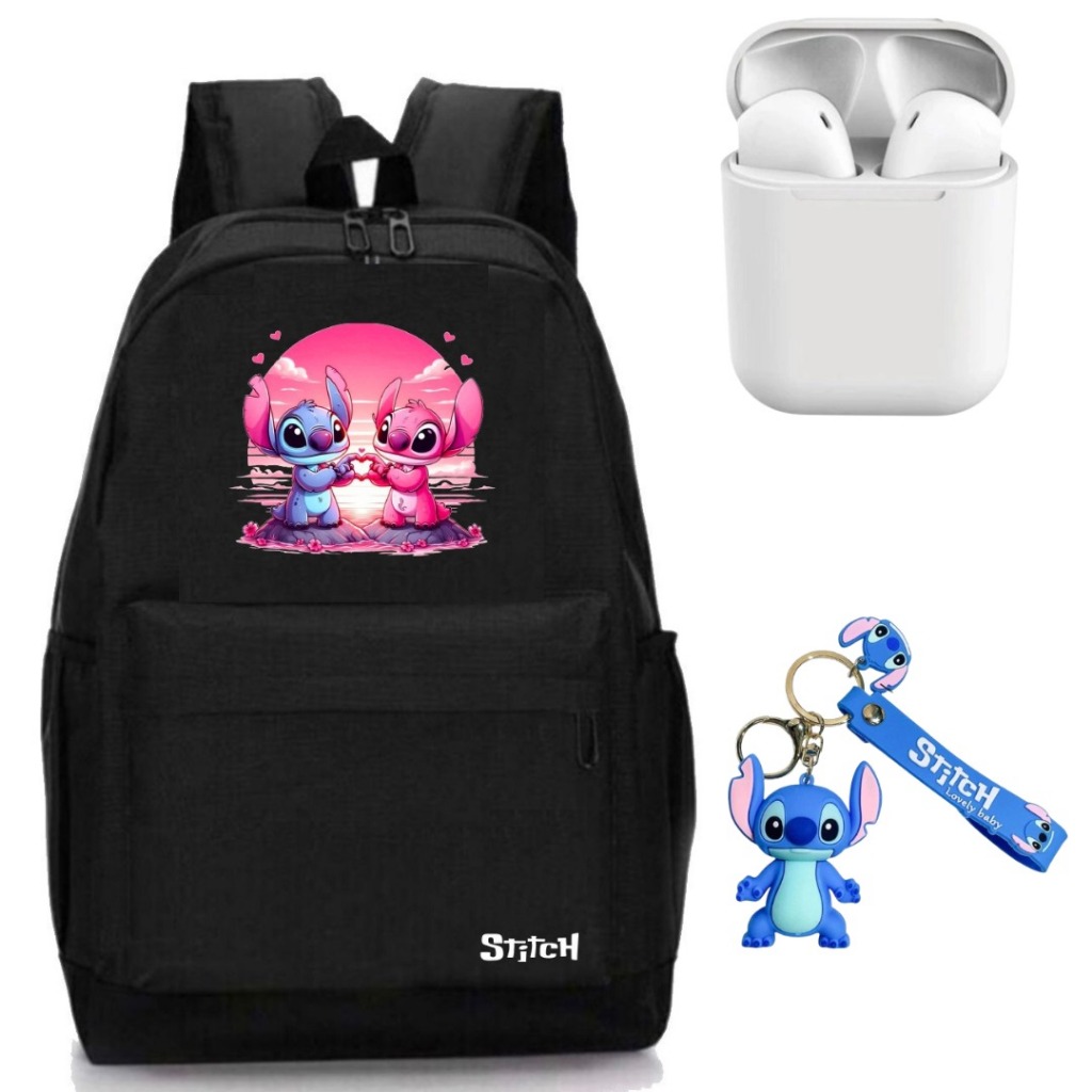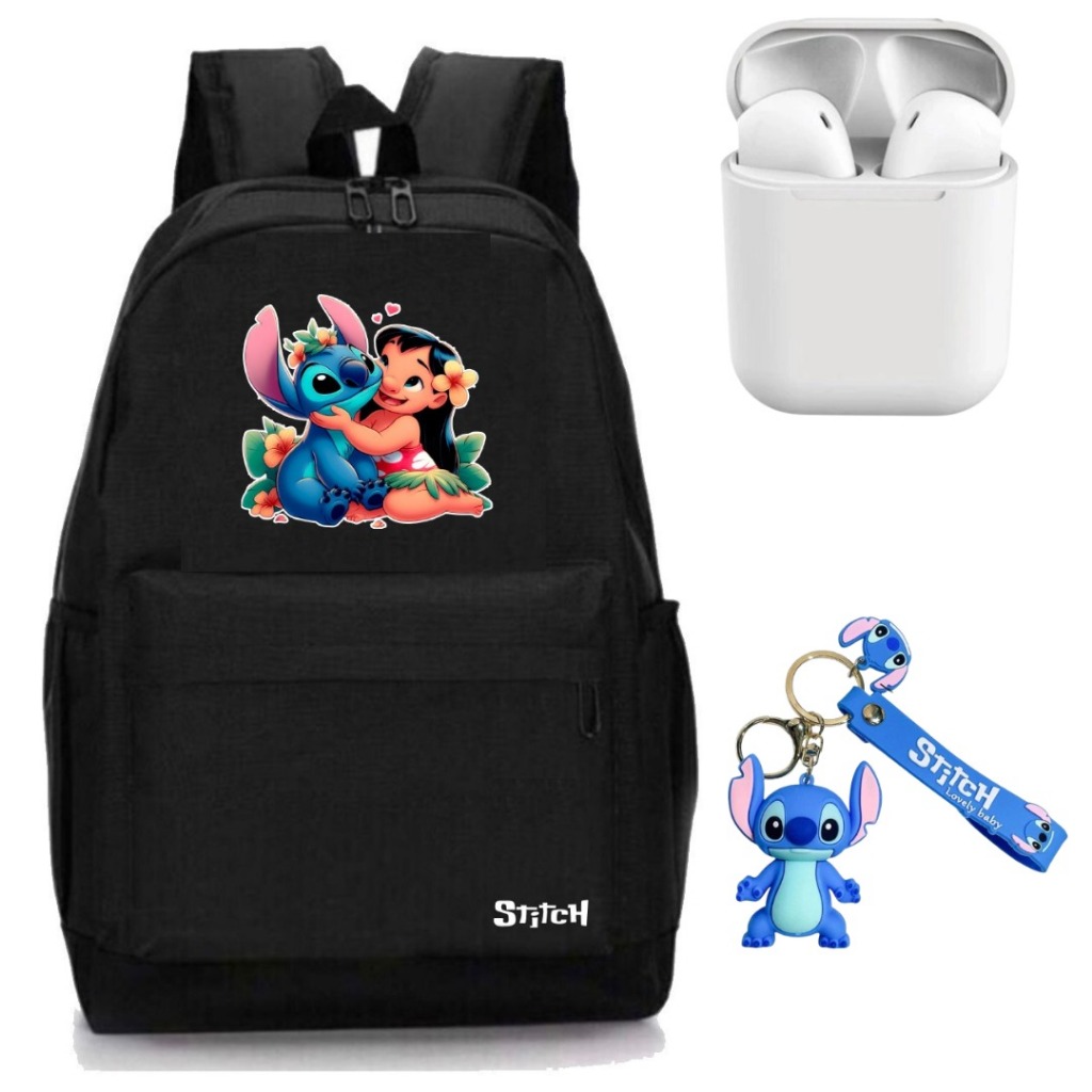Mochila Masculino e Feminina Reforçada Bolso Lateral + Fone de Ouvido + Chaveiro Stitch