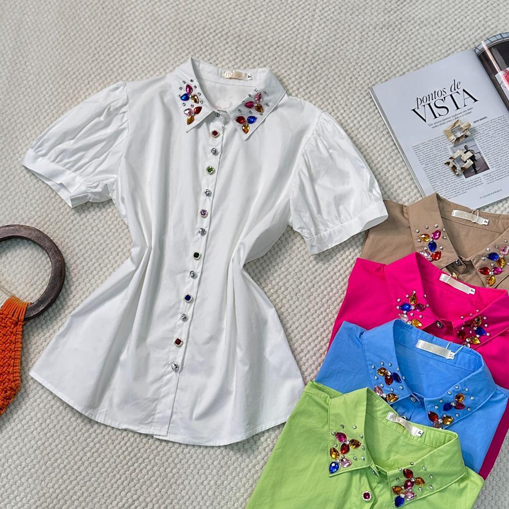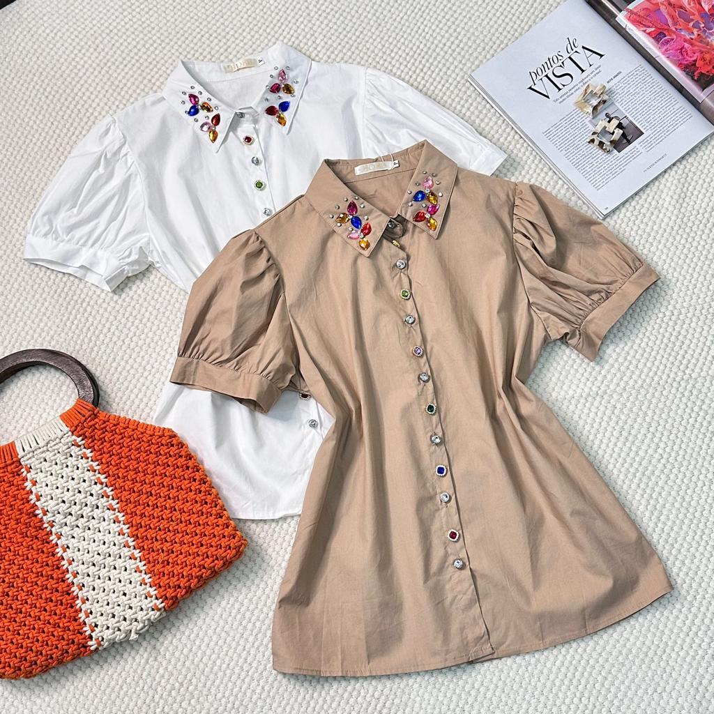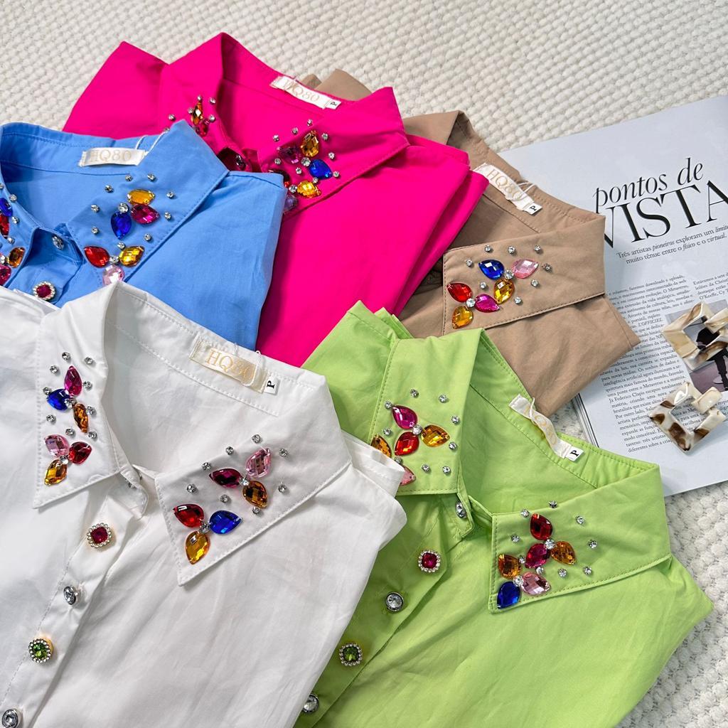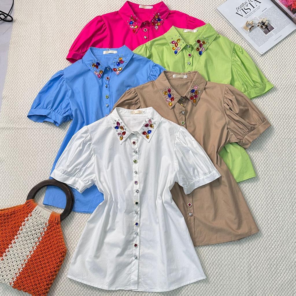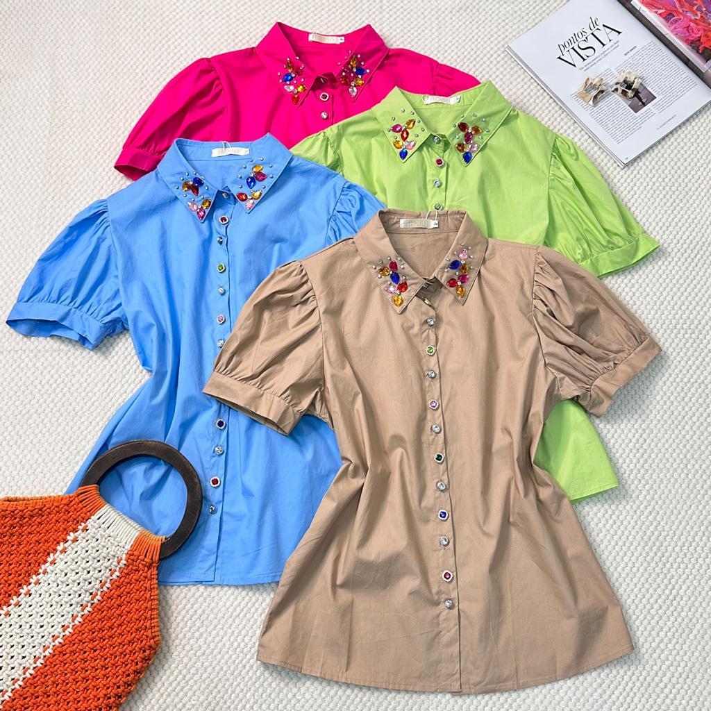 Camisa Manga Curta com Botões e Pedrarias na Gola HQ15-225