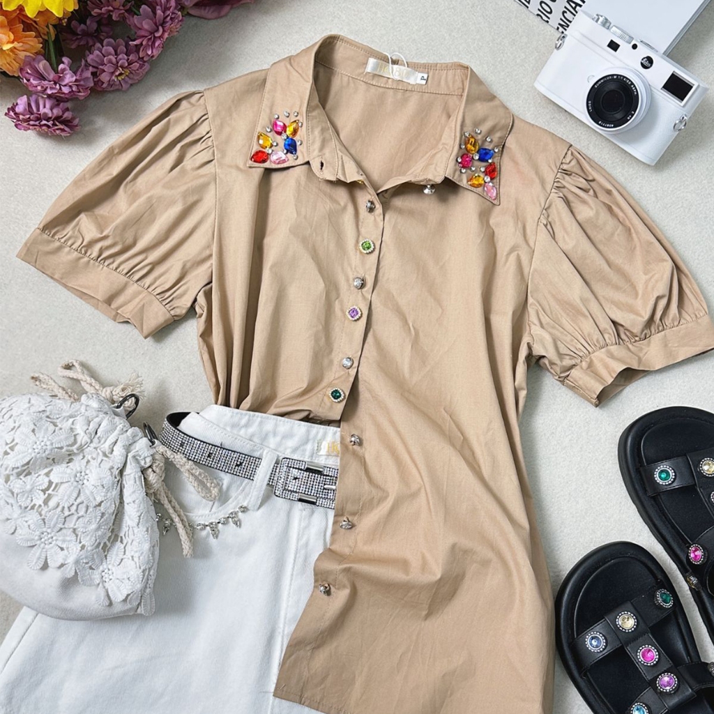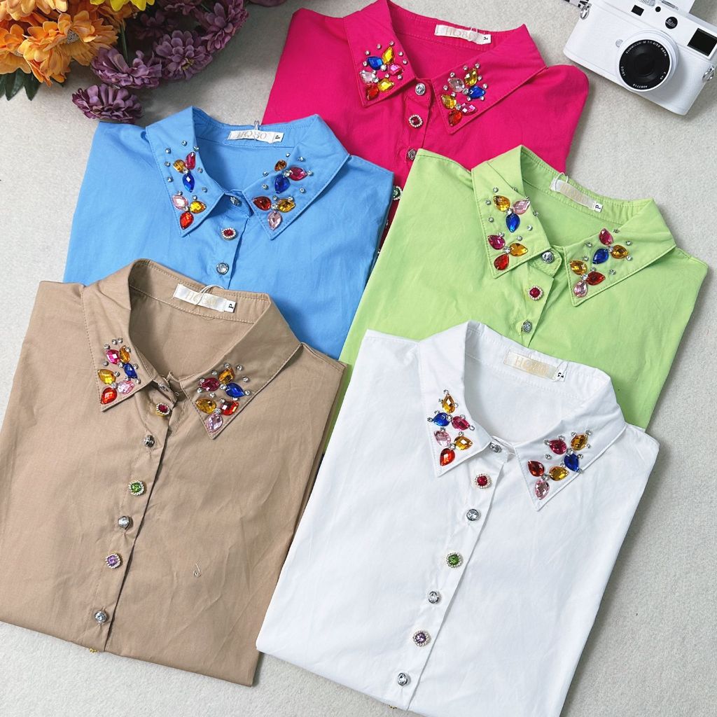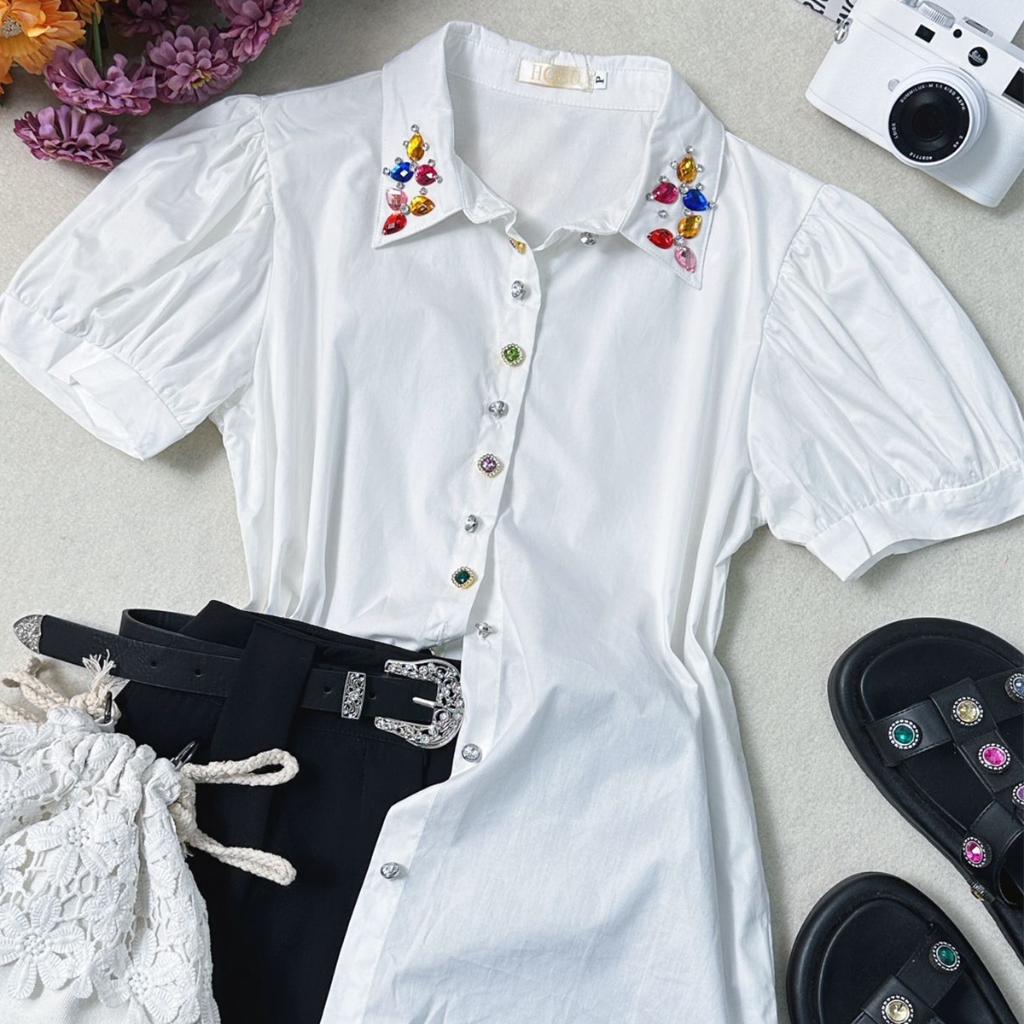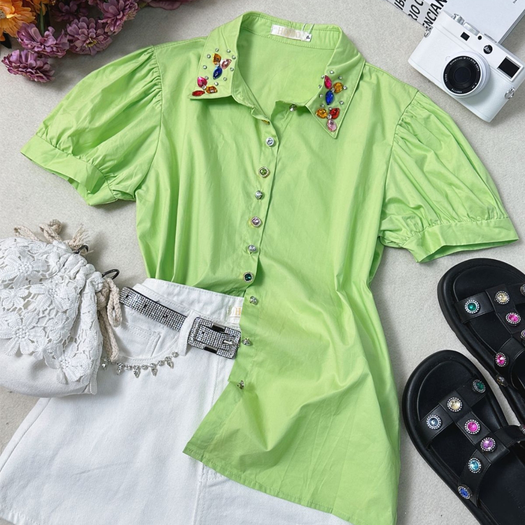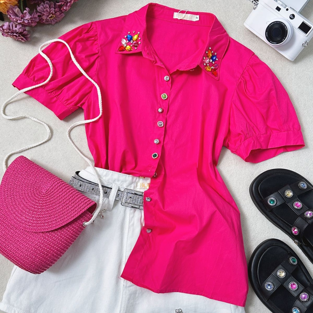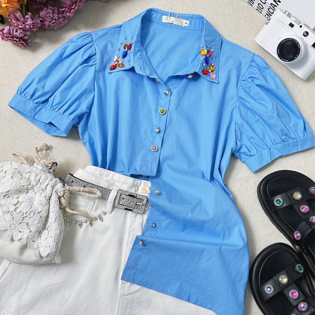 Camisa Manga Curta com Botões e Pedrarias na Gola HQ15-225