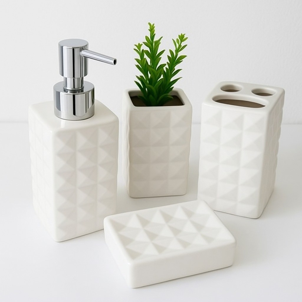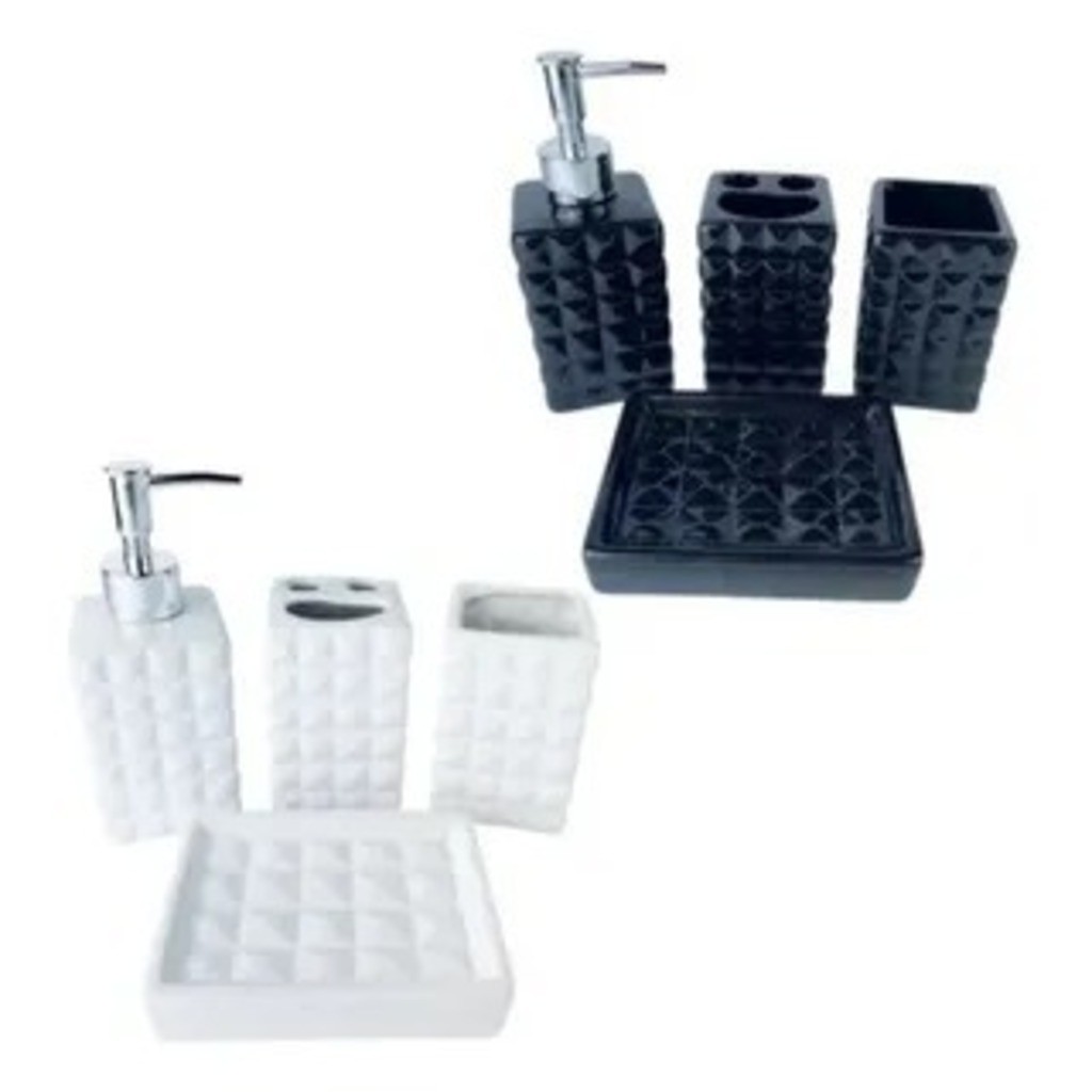 Kit Banheiro 4 Peças Porta Sabonete Líquido Saboneteira Porta Escova Dente Ceramica Textura Diamante