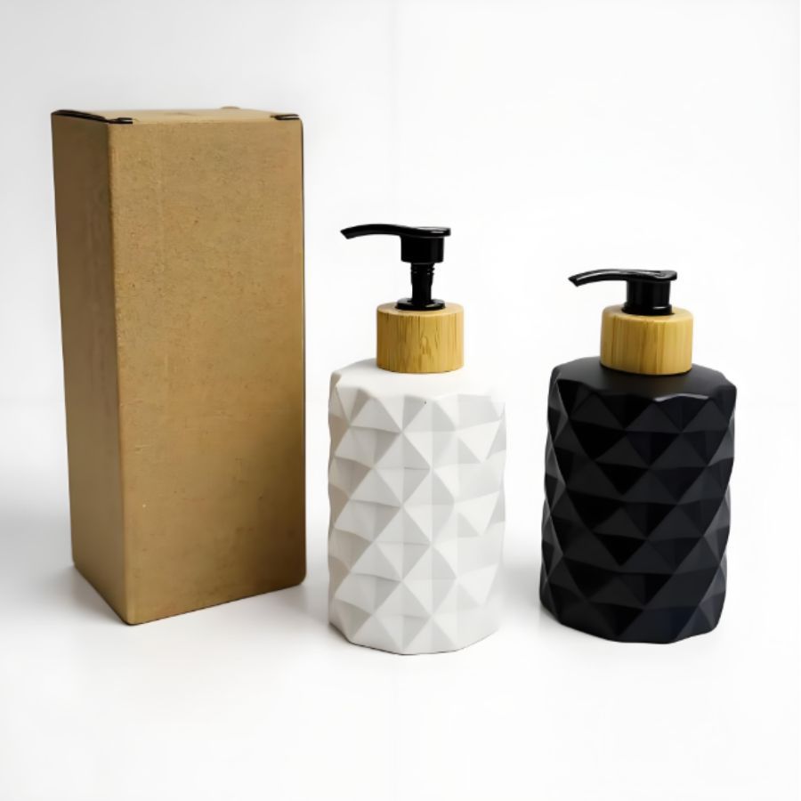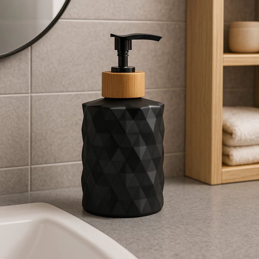 Porta Sabonete Líquido Diamante Vidro 420ML Banheiro Com Tampa De Plástico E Bambu Preto Ou Branco
