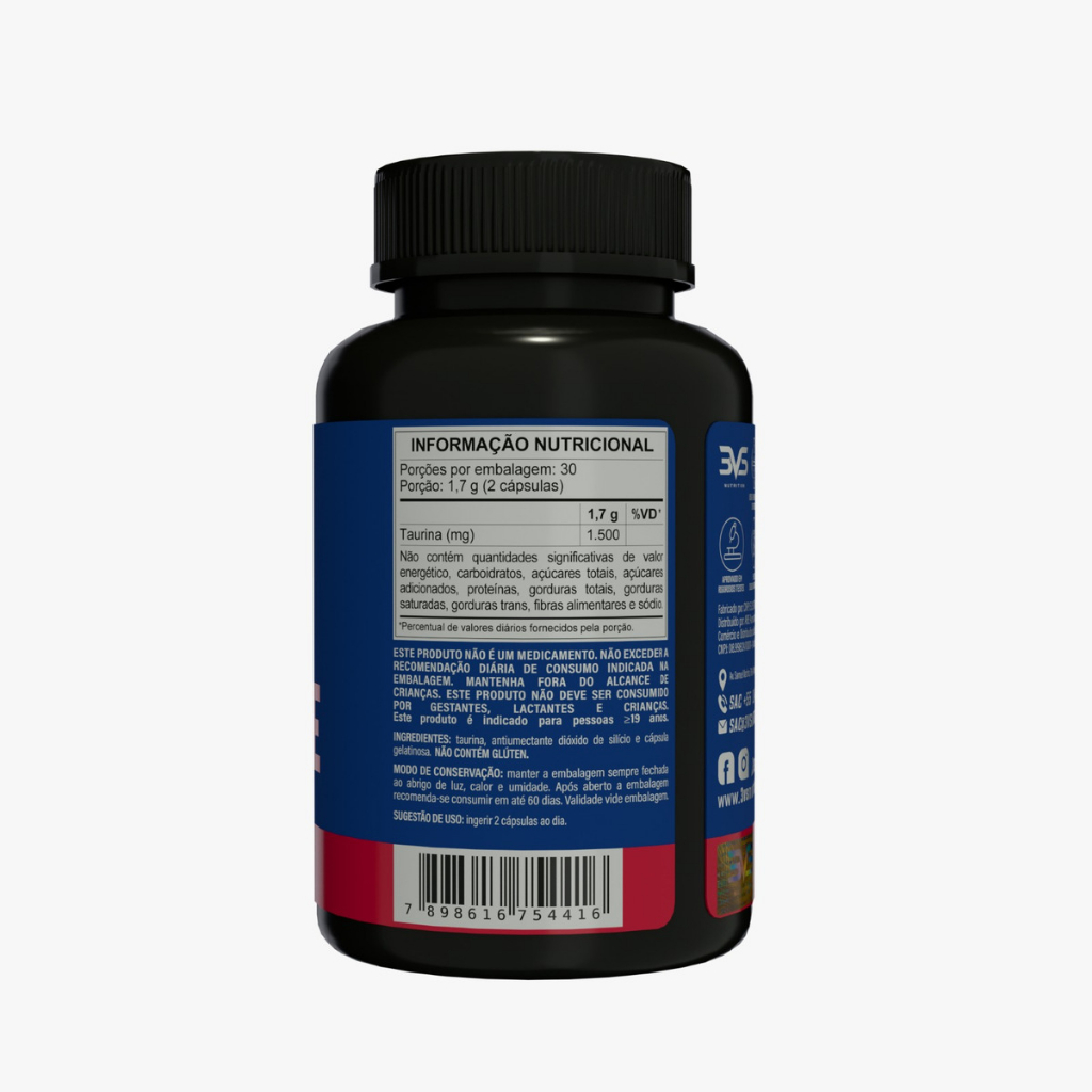 Taurina 1500mg 60 Cápsulas 3VS Nutrition Energia Foco Performance Suplemento Aminoácido Puro