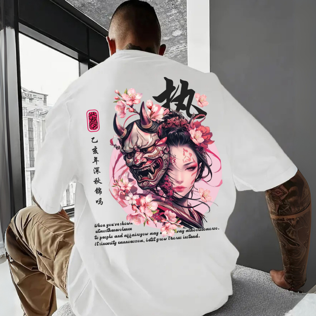 Camiseta Oversized Japonesa Oni Gueixa Flores de Cerejeira Estampa Samurai Streweear