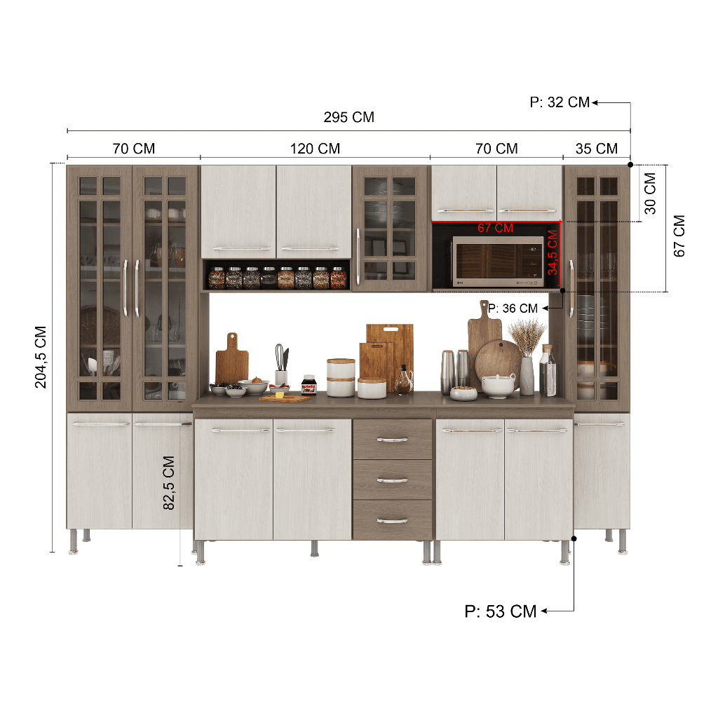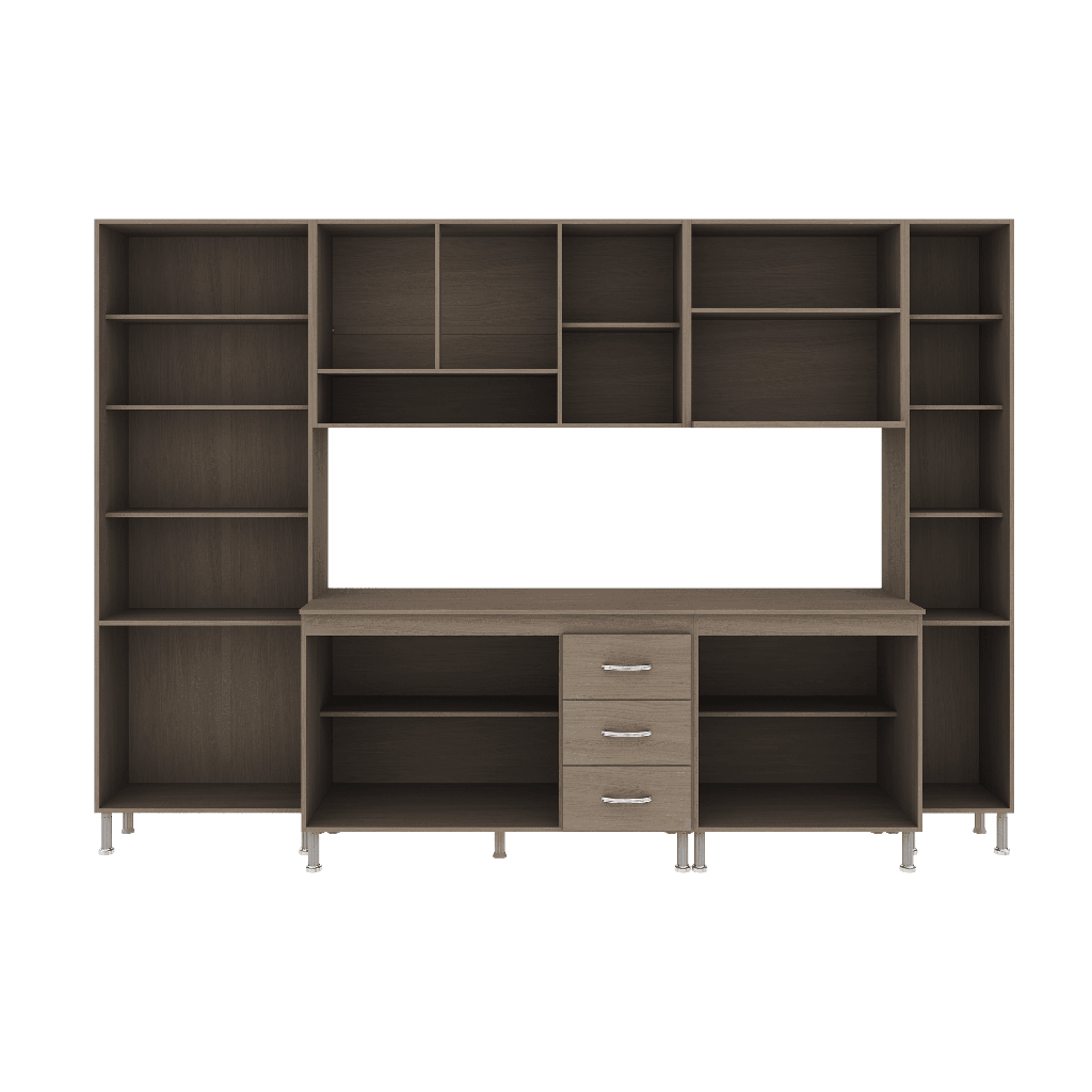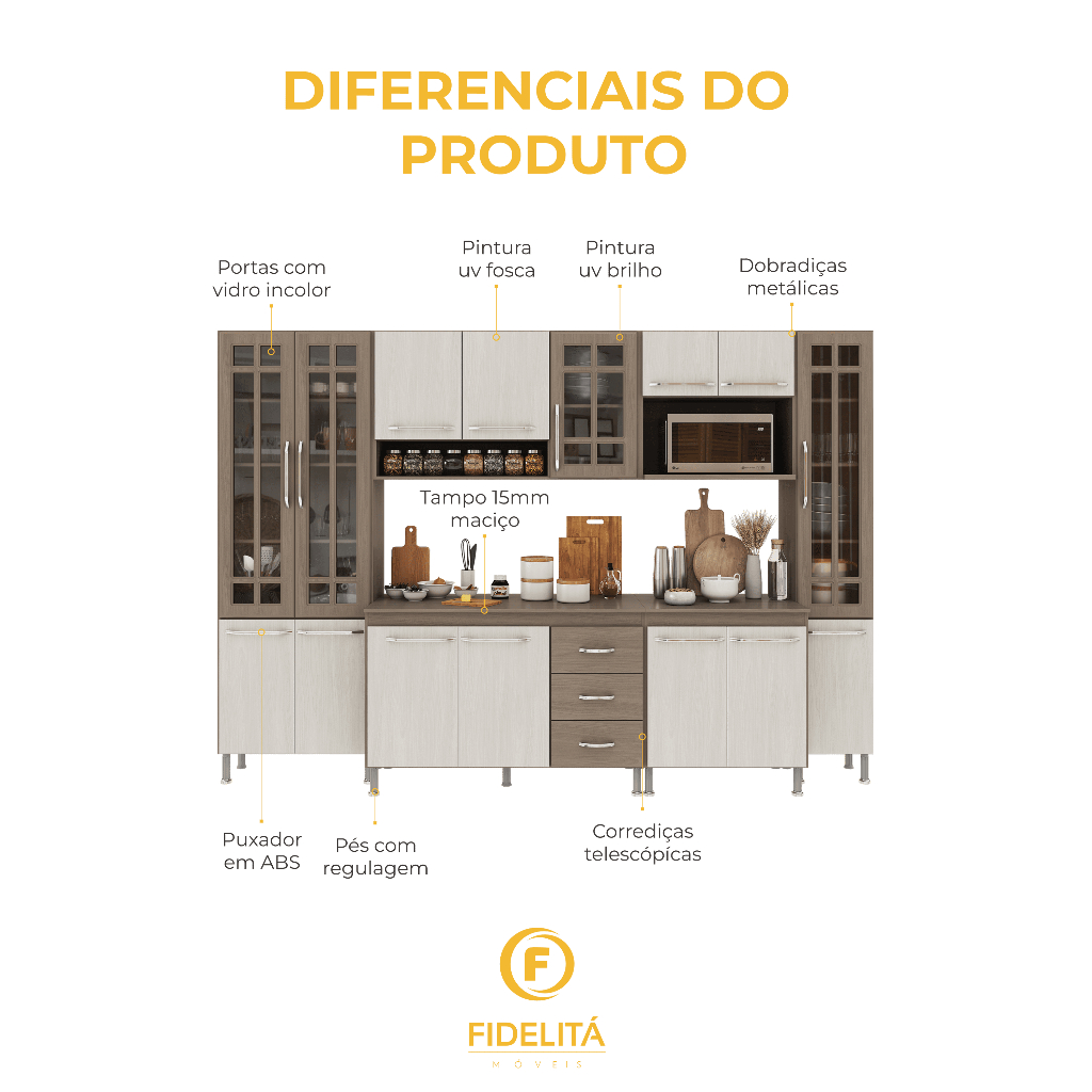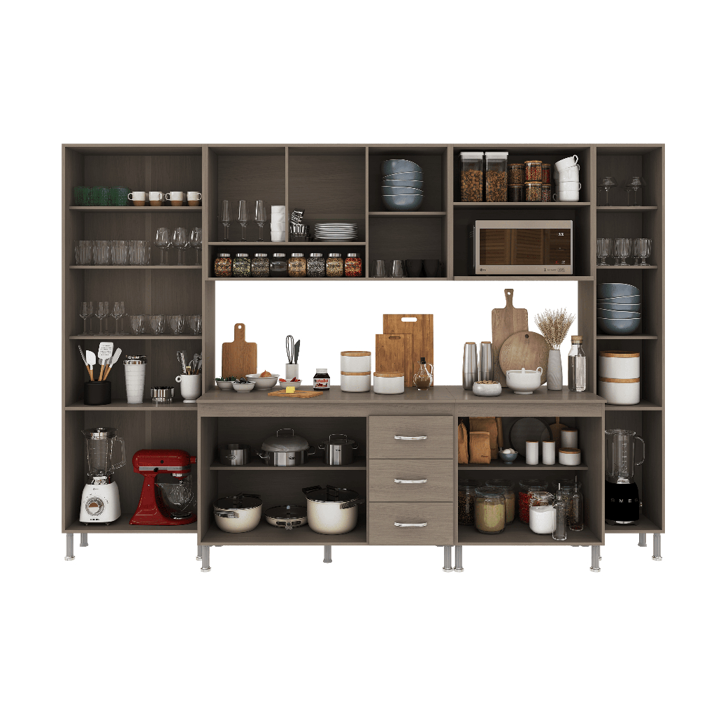 Armário de Cozinha Modulada Completa Fidelitá Paris 6 Peças 295cm 15 Portas 3 Gavetas Com Tampo Nogal/Salinas