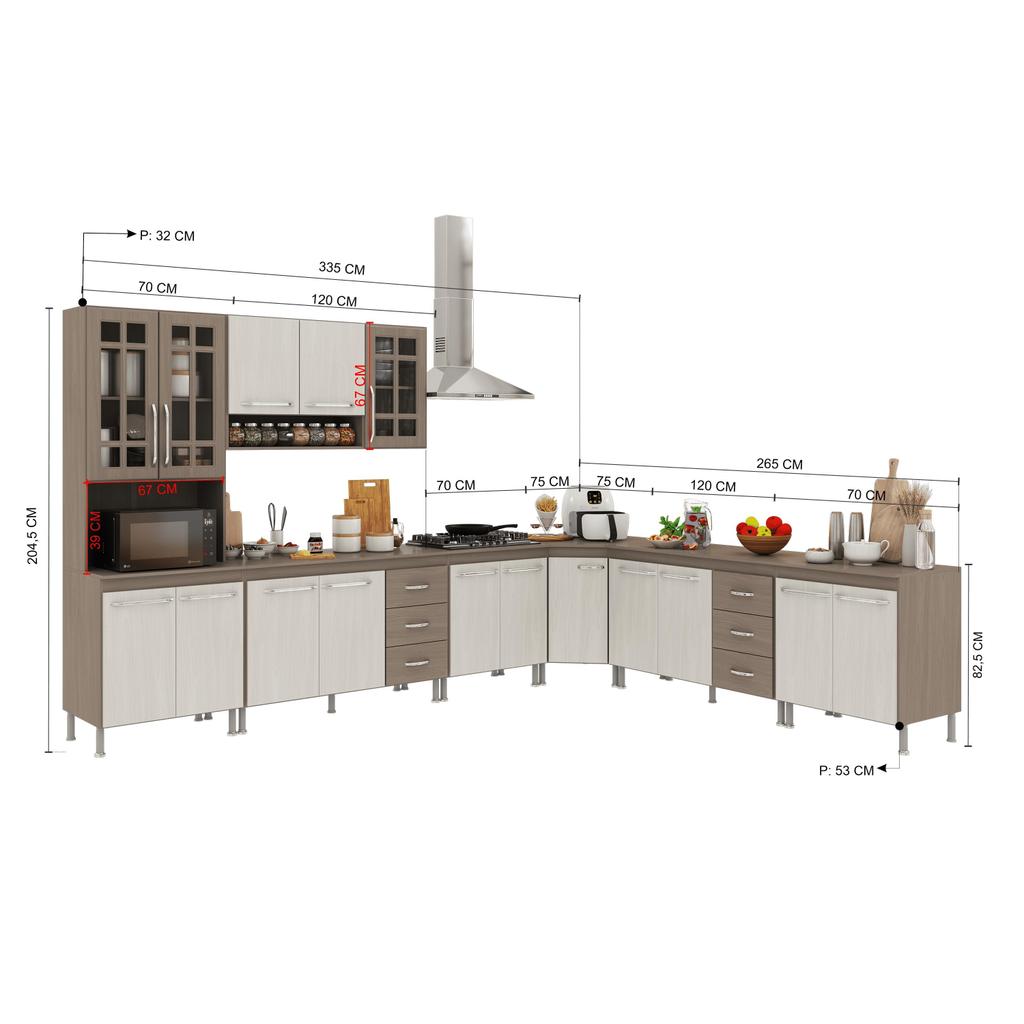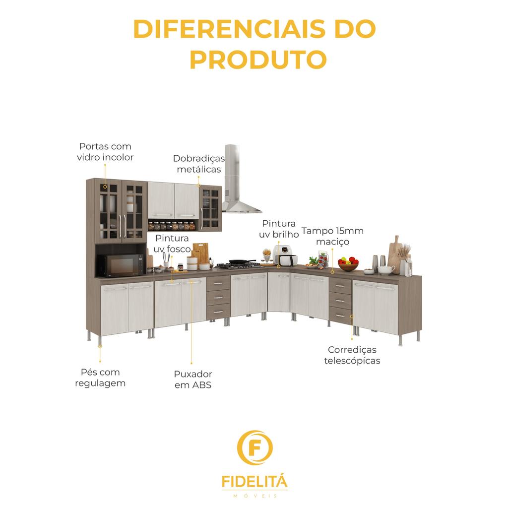 Cozinha Modulada Completa Fidelitá Paris 7 Peças 600cm 16 Portas 6 Gavetas Com Tampo Nogal/Salinas