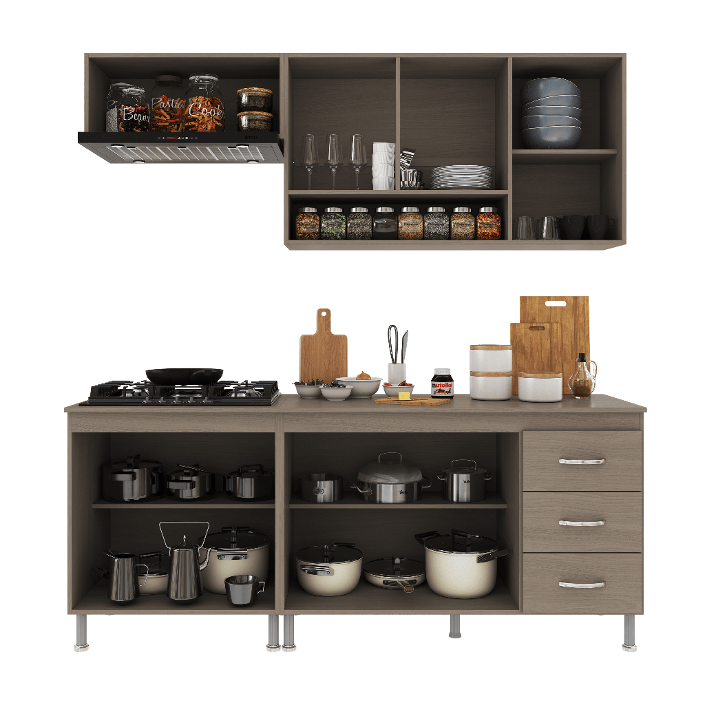 Armário de Cozinha Modulada Compacta Fidelitá Paris 4 Peças 190cm 9 Portas 3 Gavetas Com Tampo Nogal/Salinas