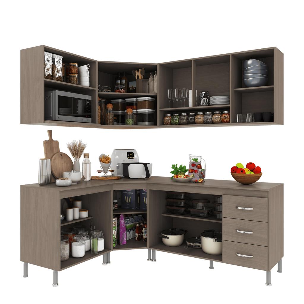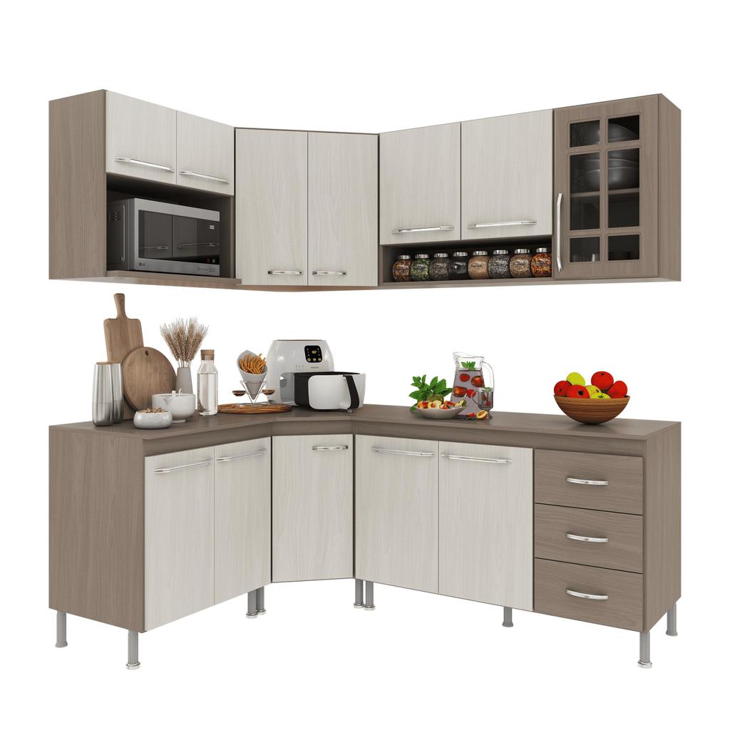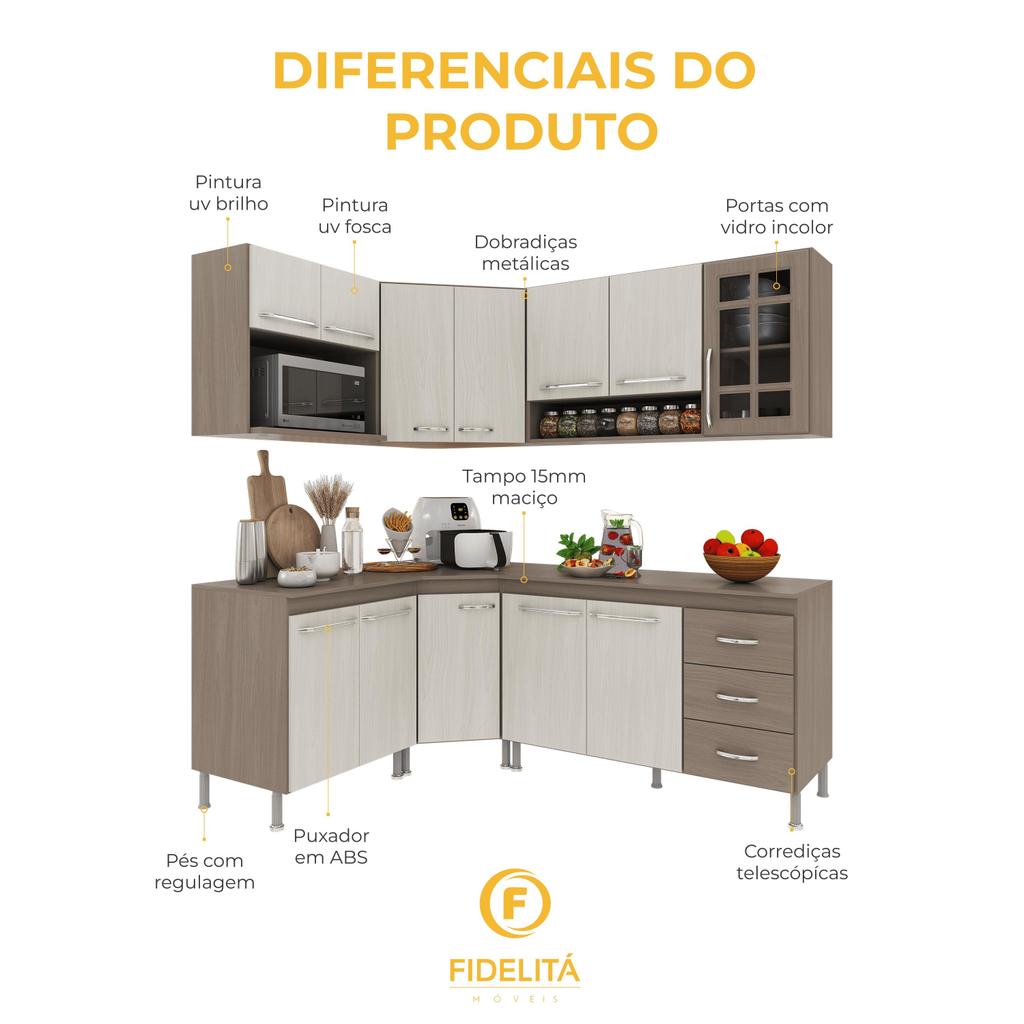 Cozinha Modulada Completa Fidelitá Paris 6 Peças 340cm 12 Portas 3 Gavetas Com Tampo Nogal/Salinas