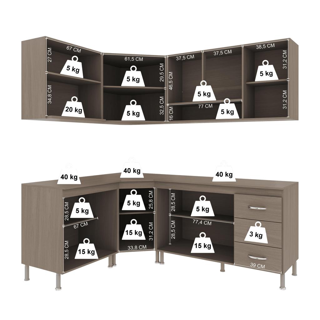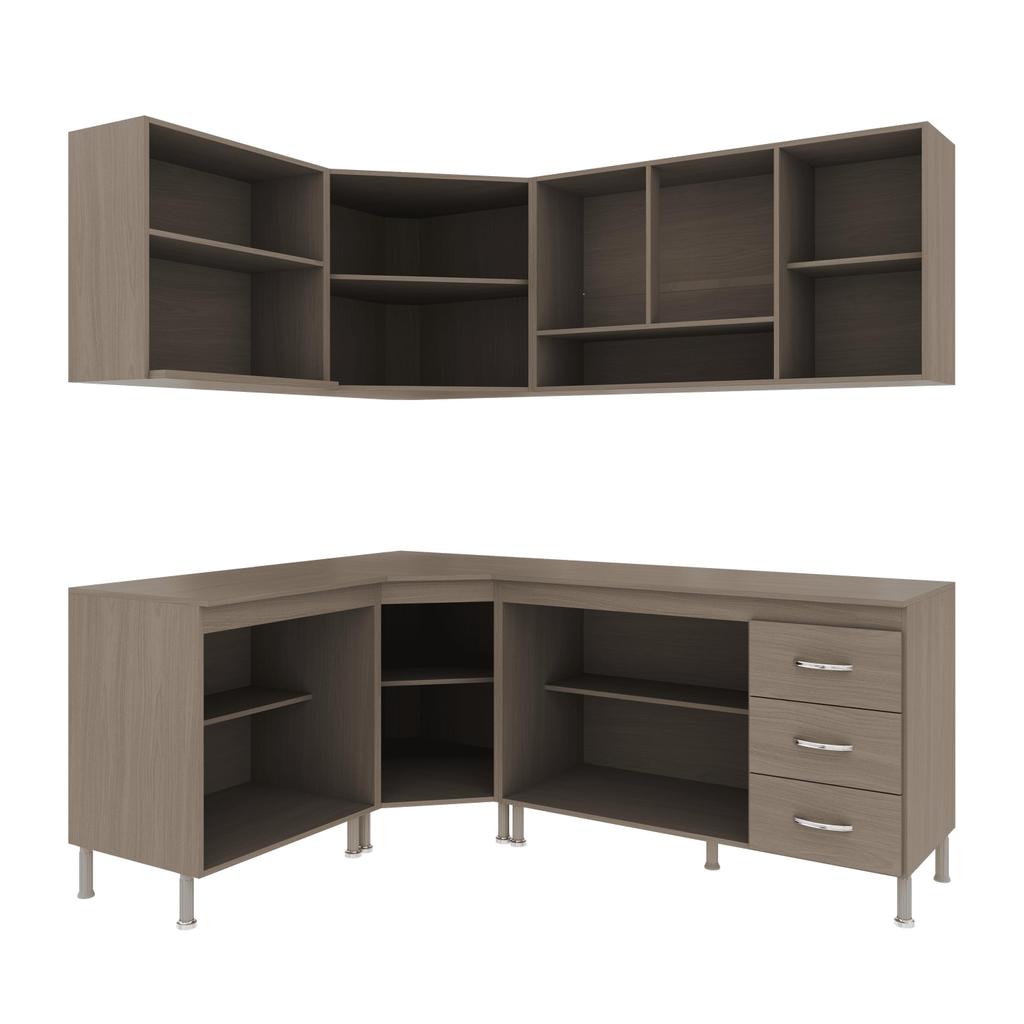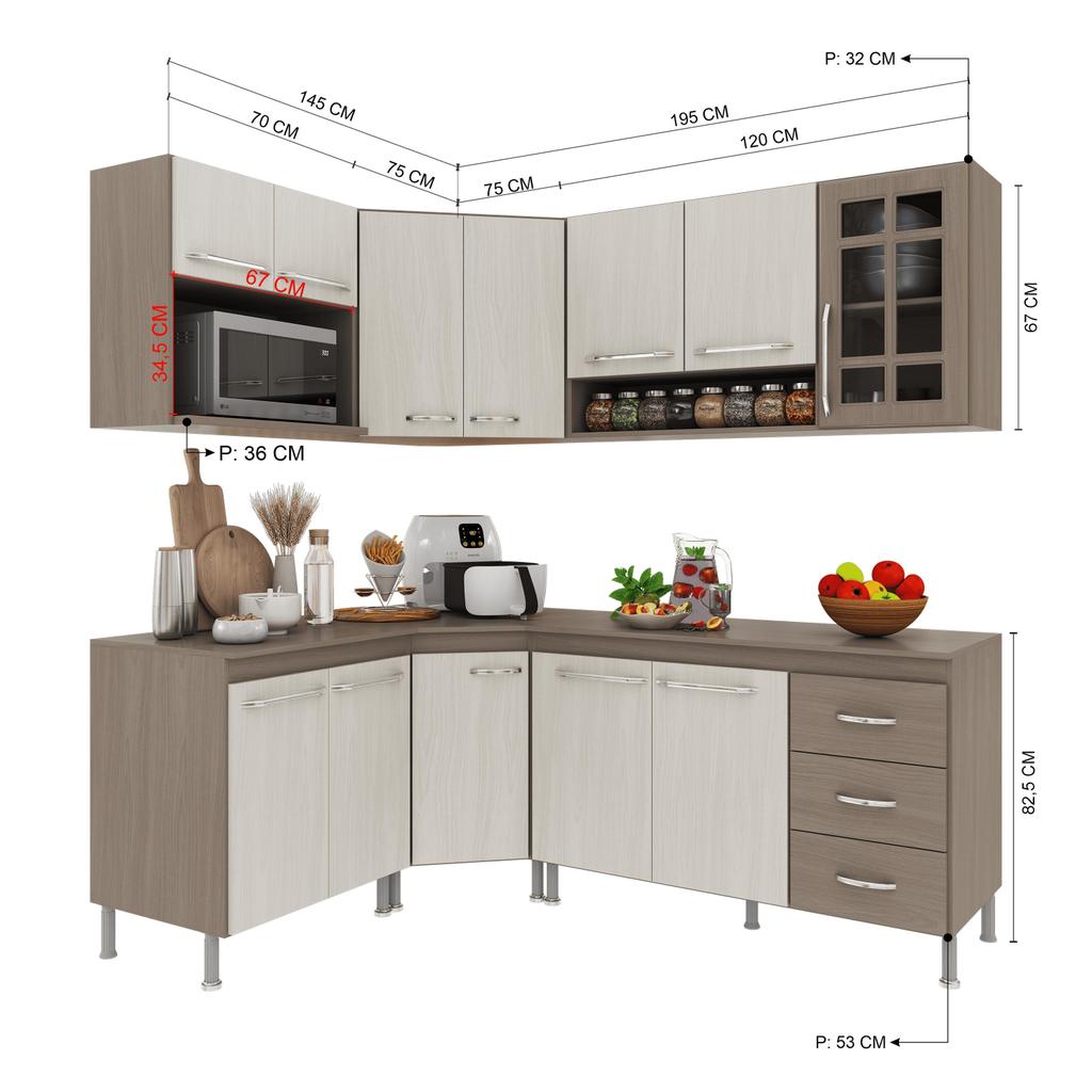 Cozinha Modulada Completa Fidelitá Paris 6 Peças 340cm 12 Portas 3 Gavetas Com Tampo Nogal/Salinas