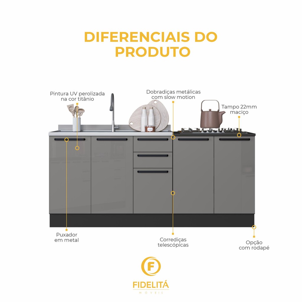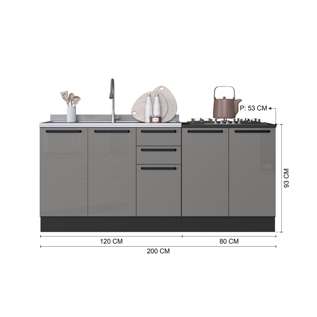 Kit 2 Balcões Modulados Gabinete Pia 120cm e Cooktop 80cm Mônaco Com Rodapé Sem Tampo Chumbo/Titânio