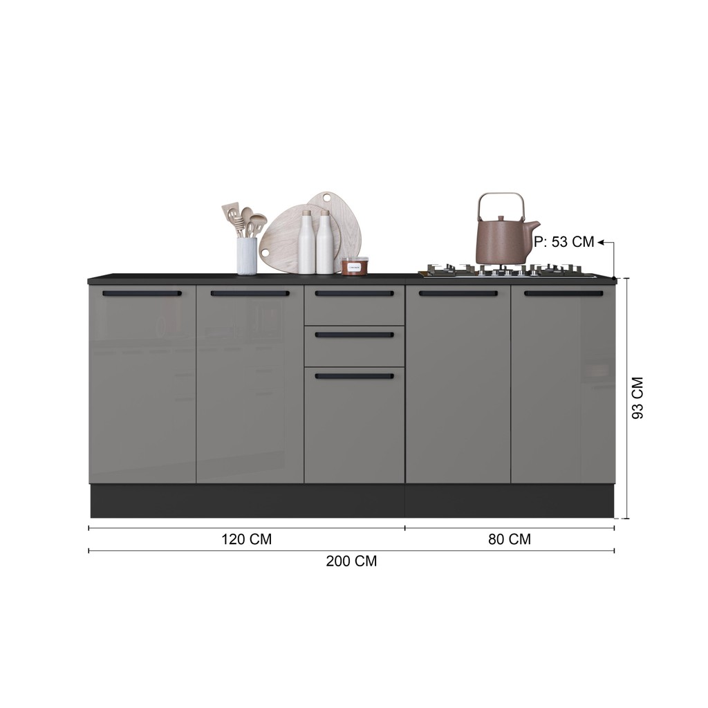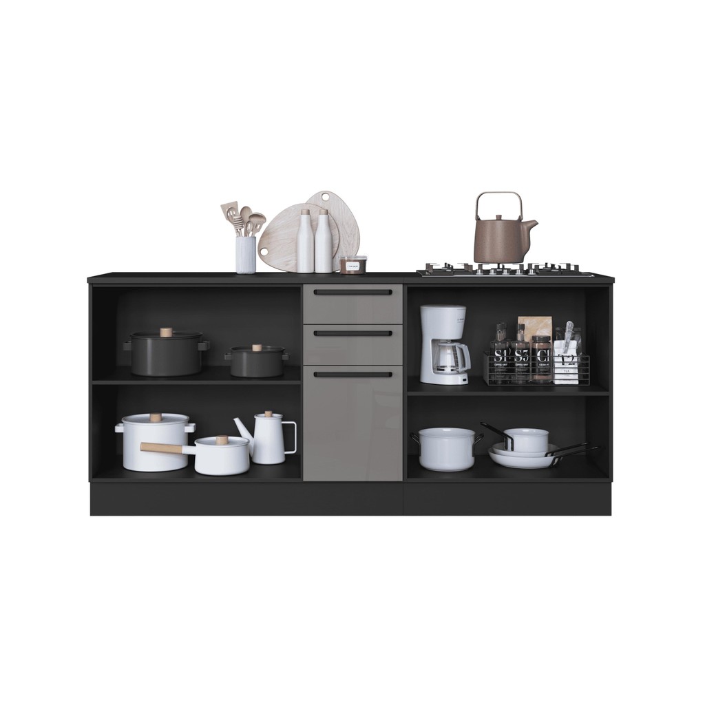 Kit 2 Balcões Modulados Gabinete Pia 120cm e Cooktop 80cm Mônaco Com Rodapé Com Tampo Chumbo/Titânio