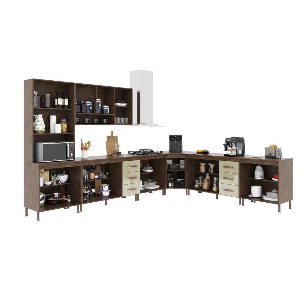 Cozinha Modulada Completa Fidelitá Lisboa 7 Peças 600cm 16 Portas 6 Gavetas Com Tampo Noce/Off-White