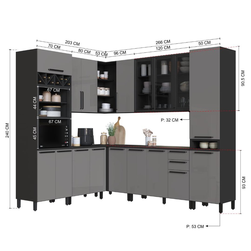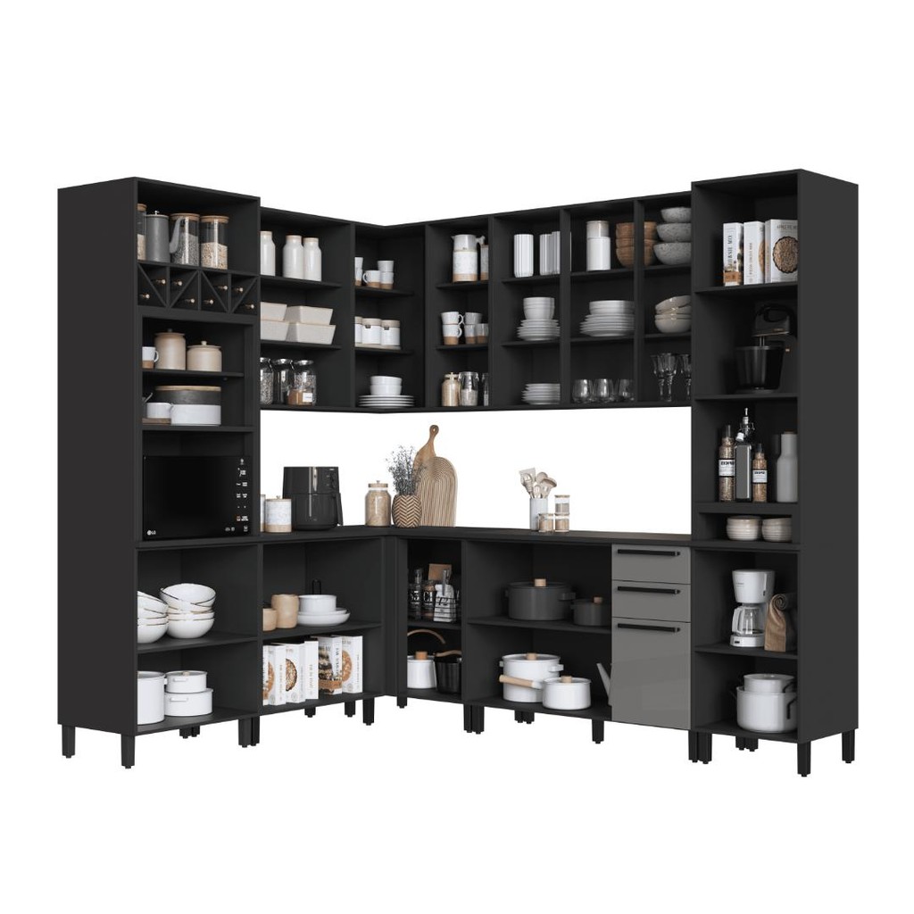 Cozinha Modulada Completa Fidelitá Mônaco 8 Peças 449cm 17 Portas 2 Gavetas Com Tampo Chumbo/Titânio