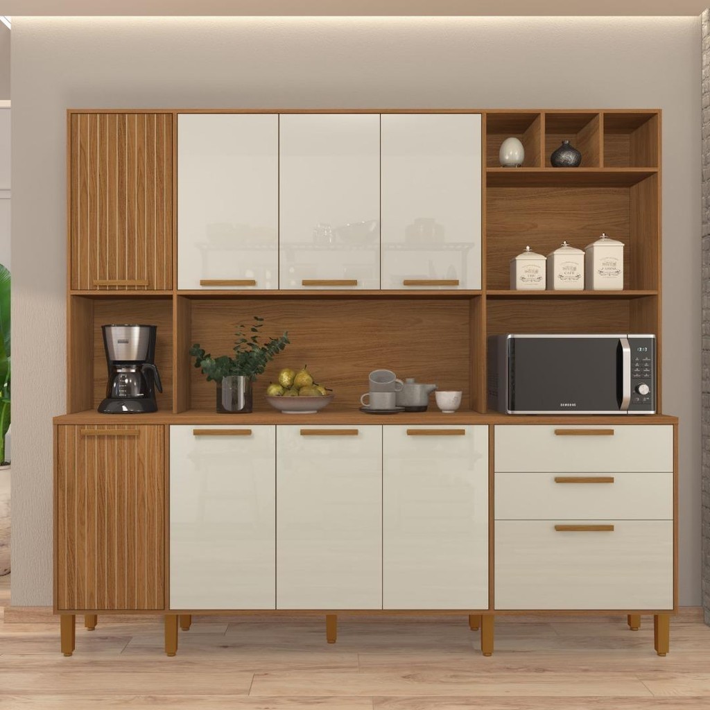 Armário de Cozinha Compacta Fidelitá Provença 219cm 9 Portas 2 Gavetas Freijó/Off-White
