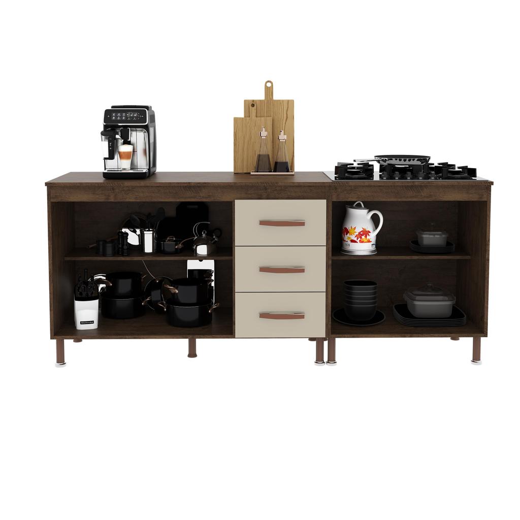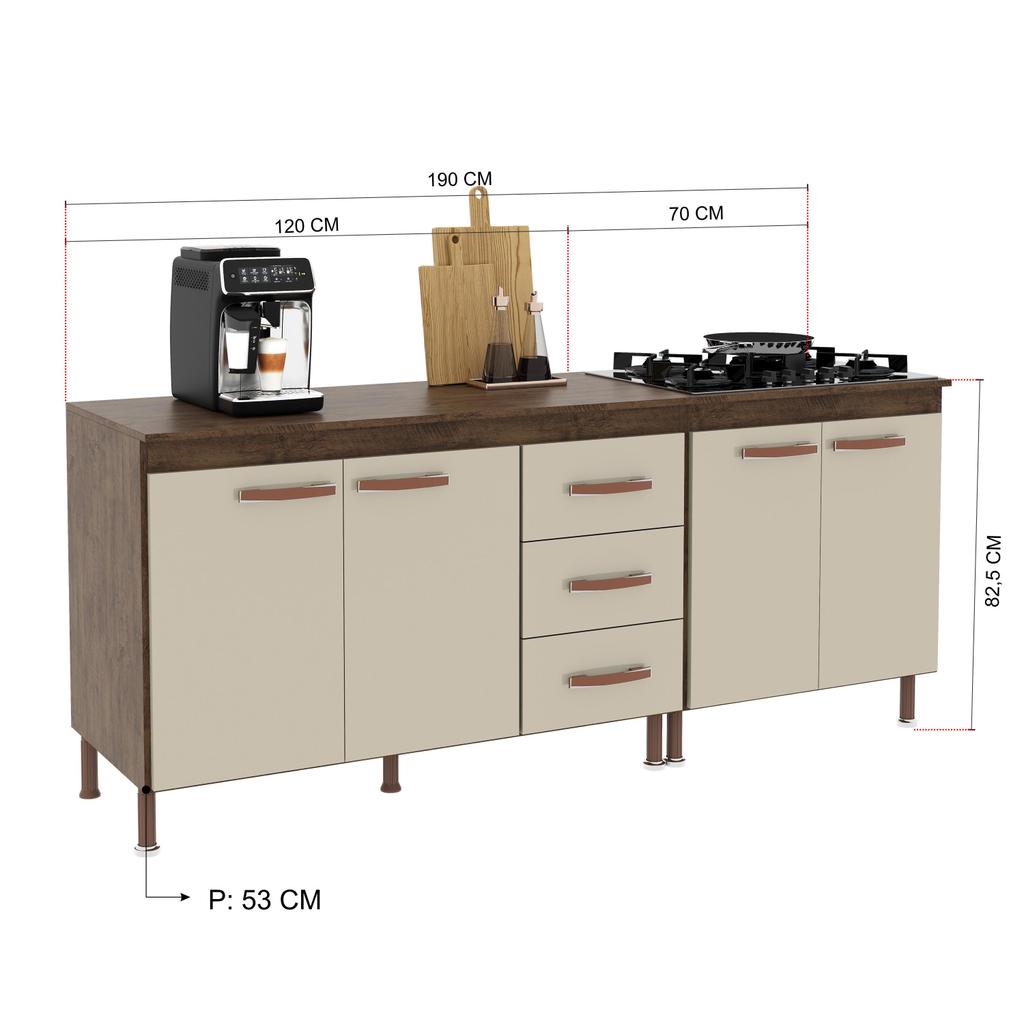 Kit 2 Balcões Modulados Gabinete Pia 120cm e Cooktop 70cm Com Tampo Lisboa Fidelitá Noce/Off-White