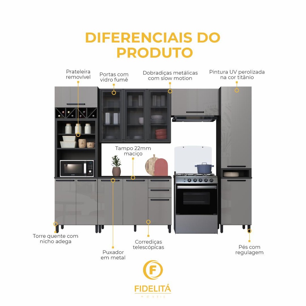 Cozinha Modulada Completa Fidelitá Mônaco 5 Peças 320cm 12 Portas 2 Gavetas Com Tampo Chumbo/Titânio