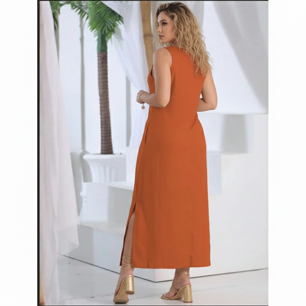 Vestido Feminino Em Linho Elegante Forrado Alça Larga Com Fenda Moda Clássica Verão