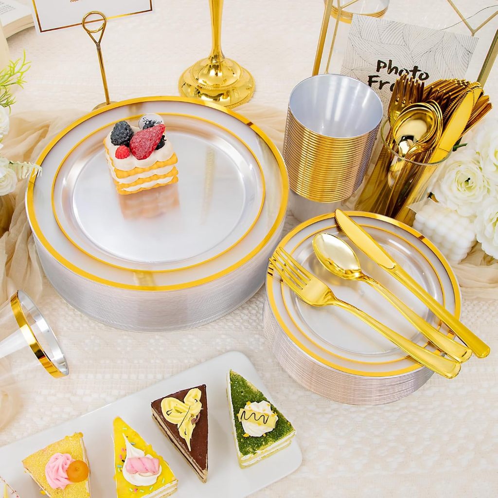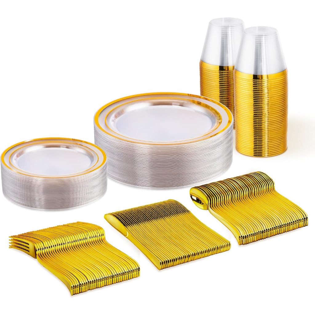 Kit 150 conjunto descartável de plástico para 25 convidados, pratos transparentes com borda dourada + talheres + copos