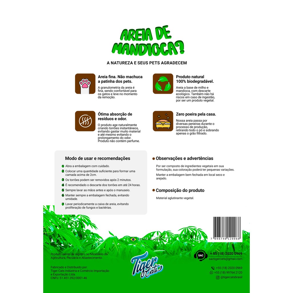 Areia Higiênica Natural Biodegradável Mandioca Para Gatos Tiger Cats 20kg
