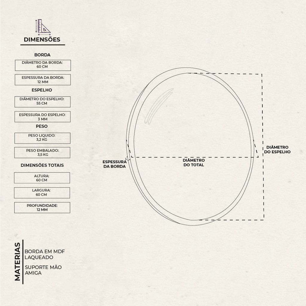 Espelho Redondo Laqueado Minimalista 60 cm + Kit de Instalação