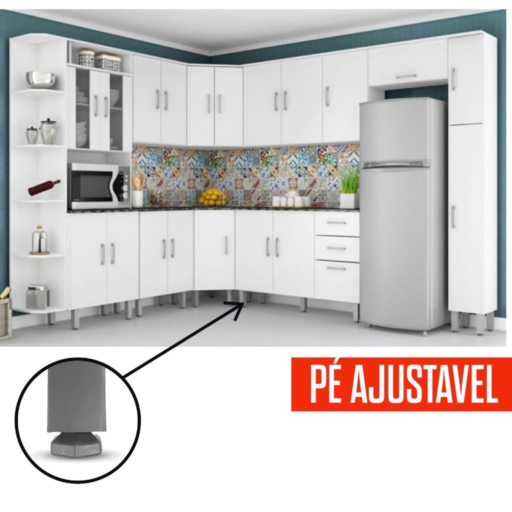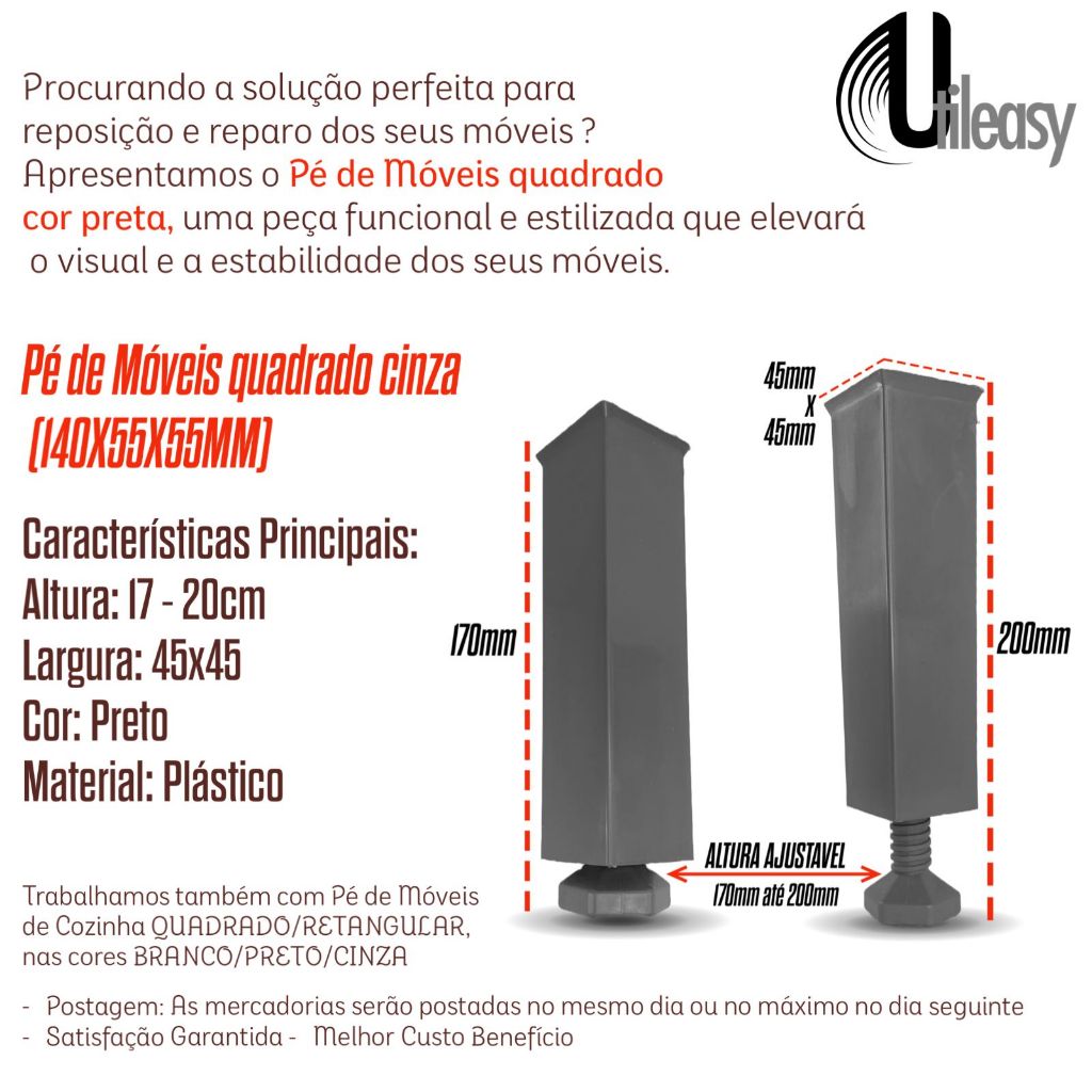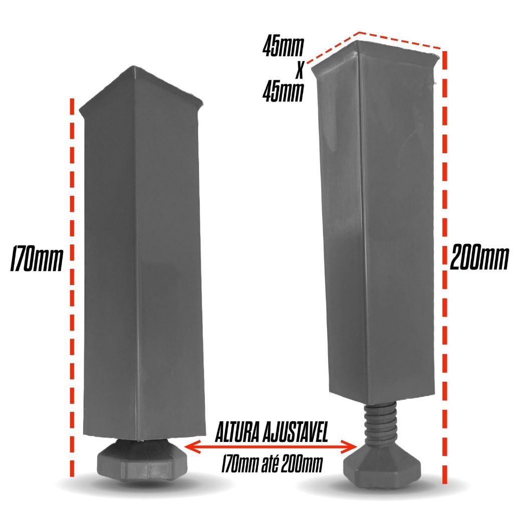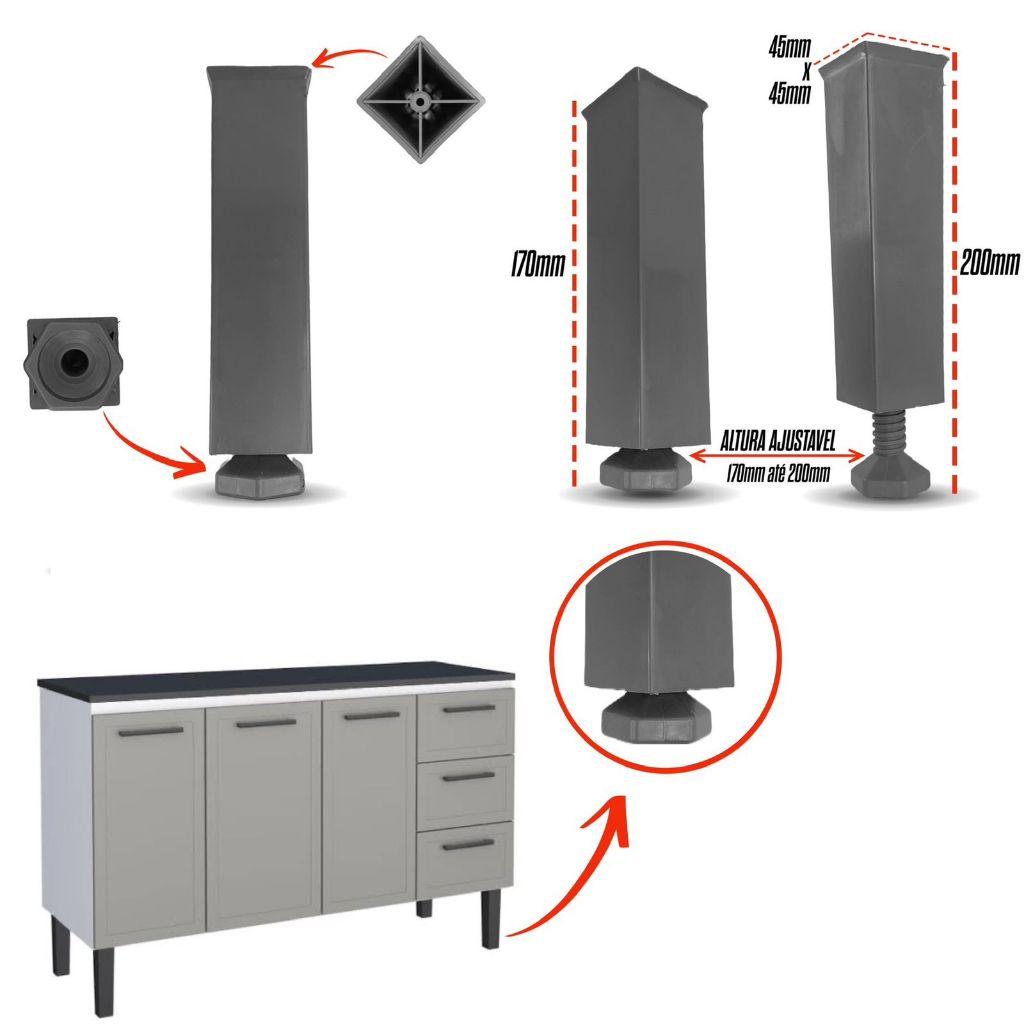 Pés p/ Armario de Cozinha Lavanderia Moveis no geral Pé Ajustável de 17 cm até 20 cm Quadrado Cinza