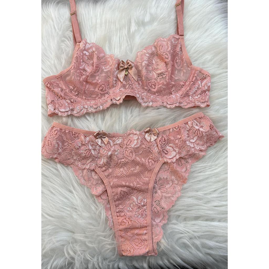 Conjunto de lingerie sutiã sem bojo com aro rendado com fio renda forrado em microfibra Moda Intima
