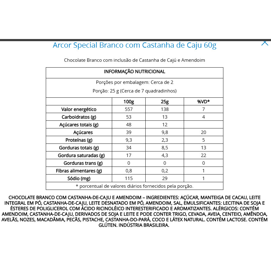 Chocolate Branco Special Castanha De Caju E Amendoim Arcor 60g