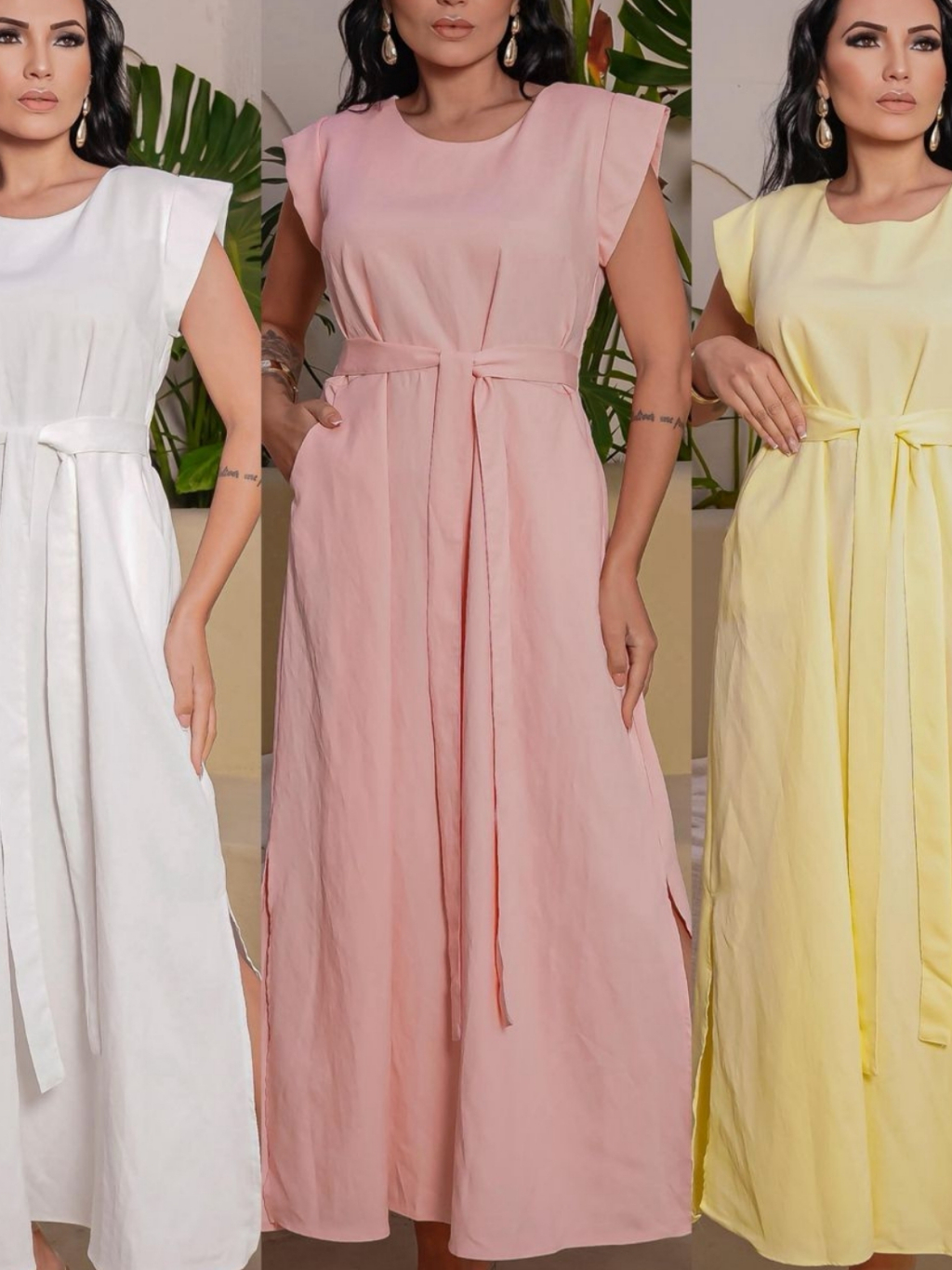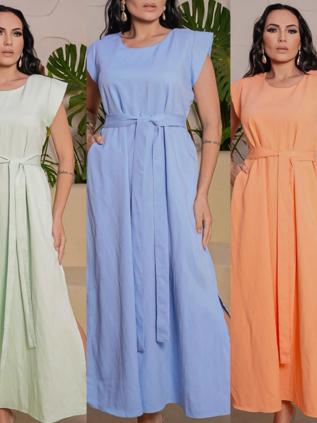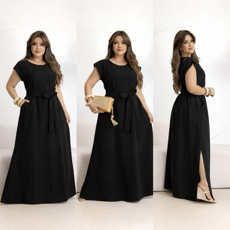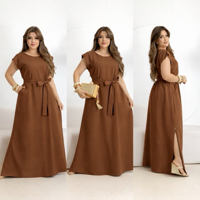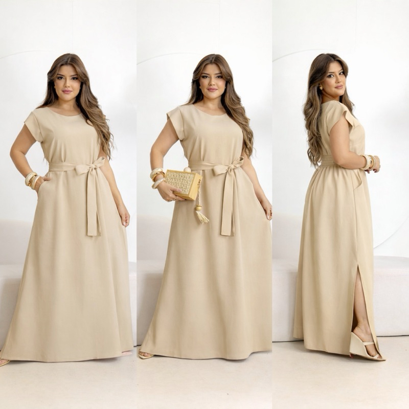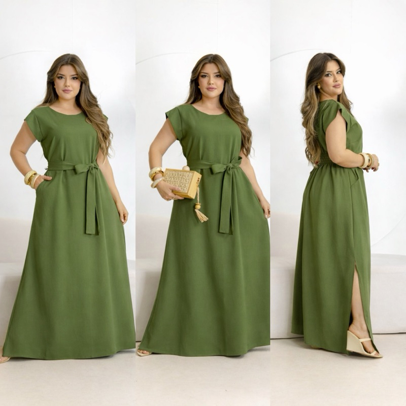 Vestido Longo Feminino Moda Evangélica Elegante com Faixa na Cintura Modelagem Solta