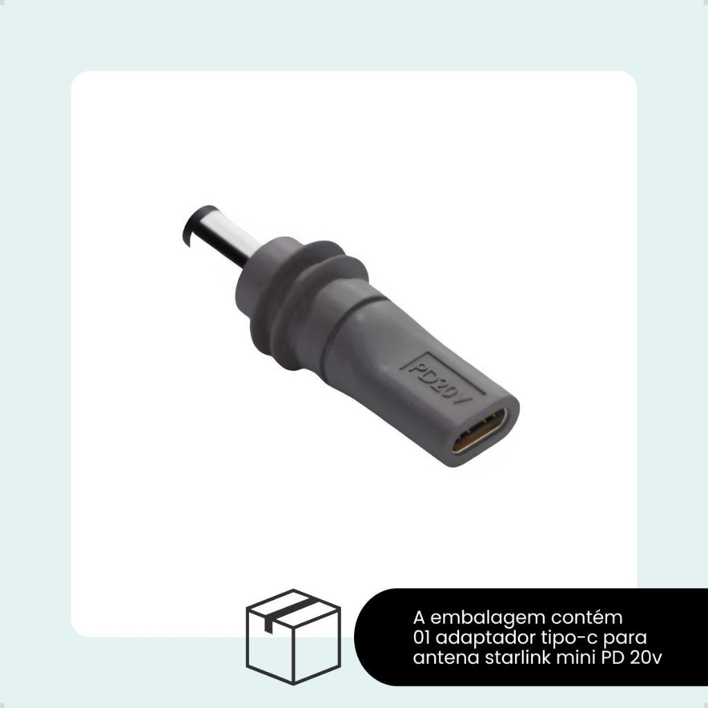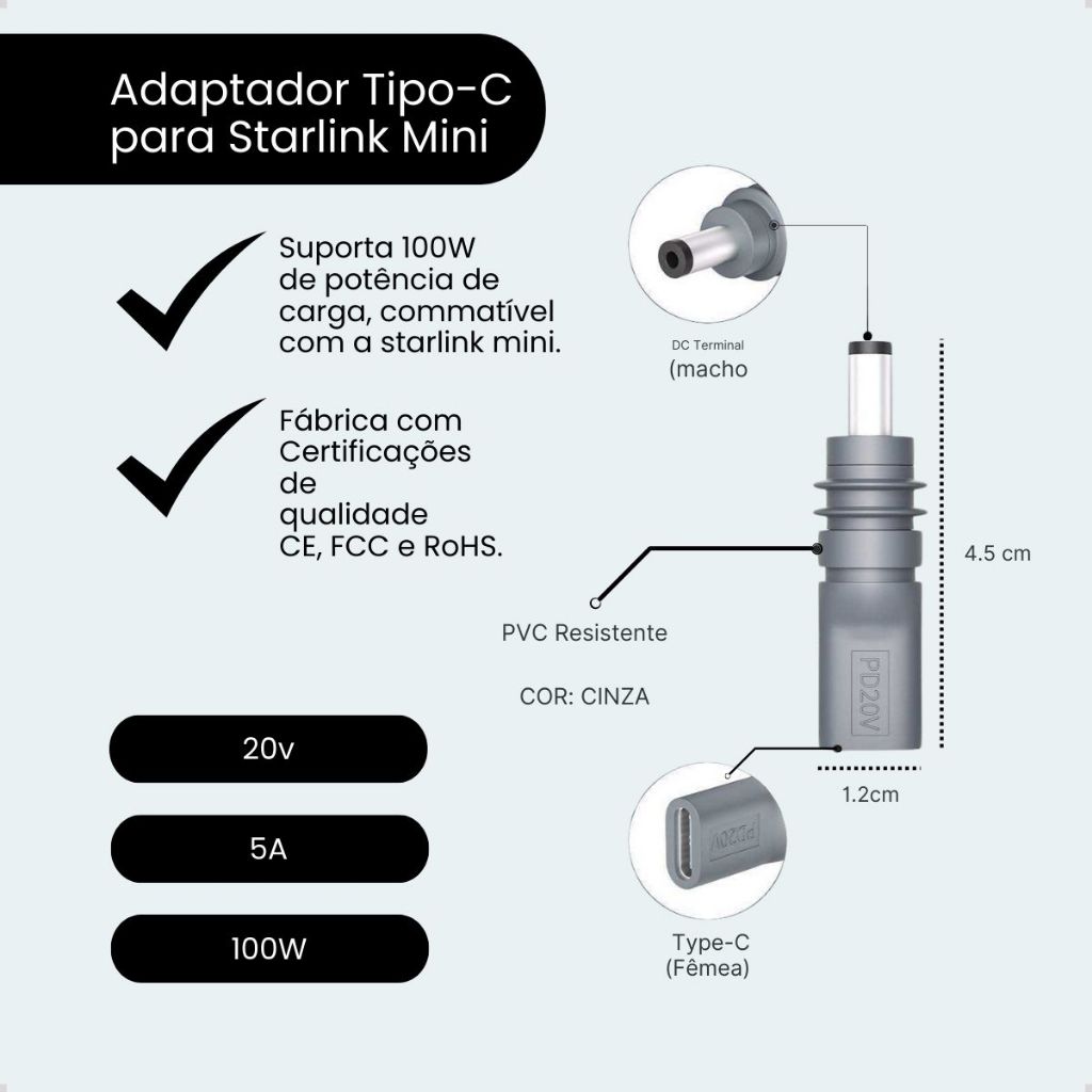 Adaptador Tipo-C DC para Starlink MINI 20v 5A 100w Cinza com chip PD power delivery