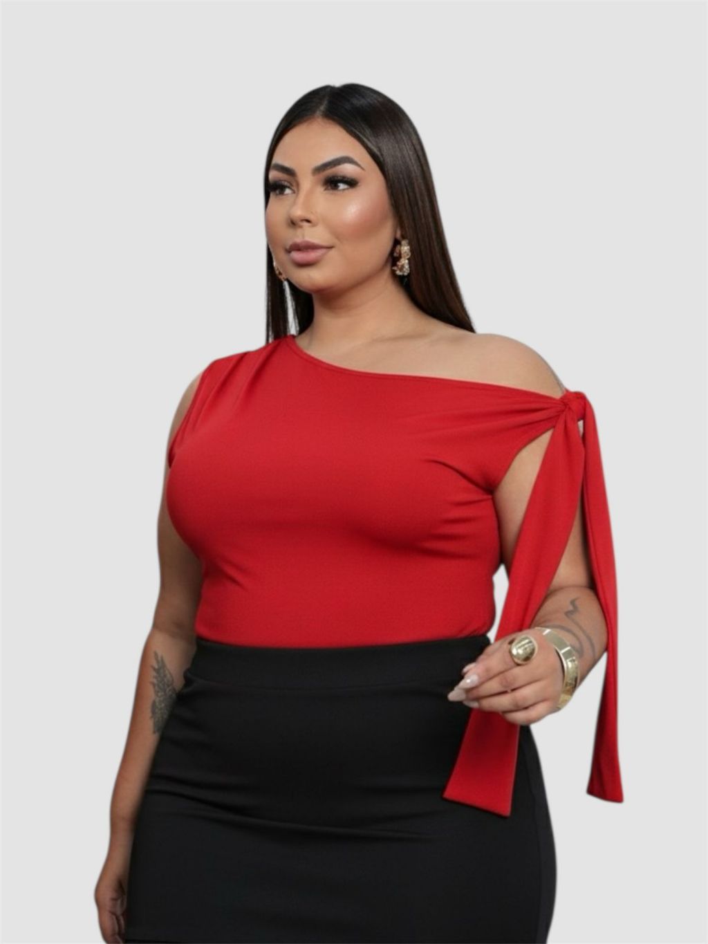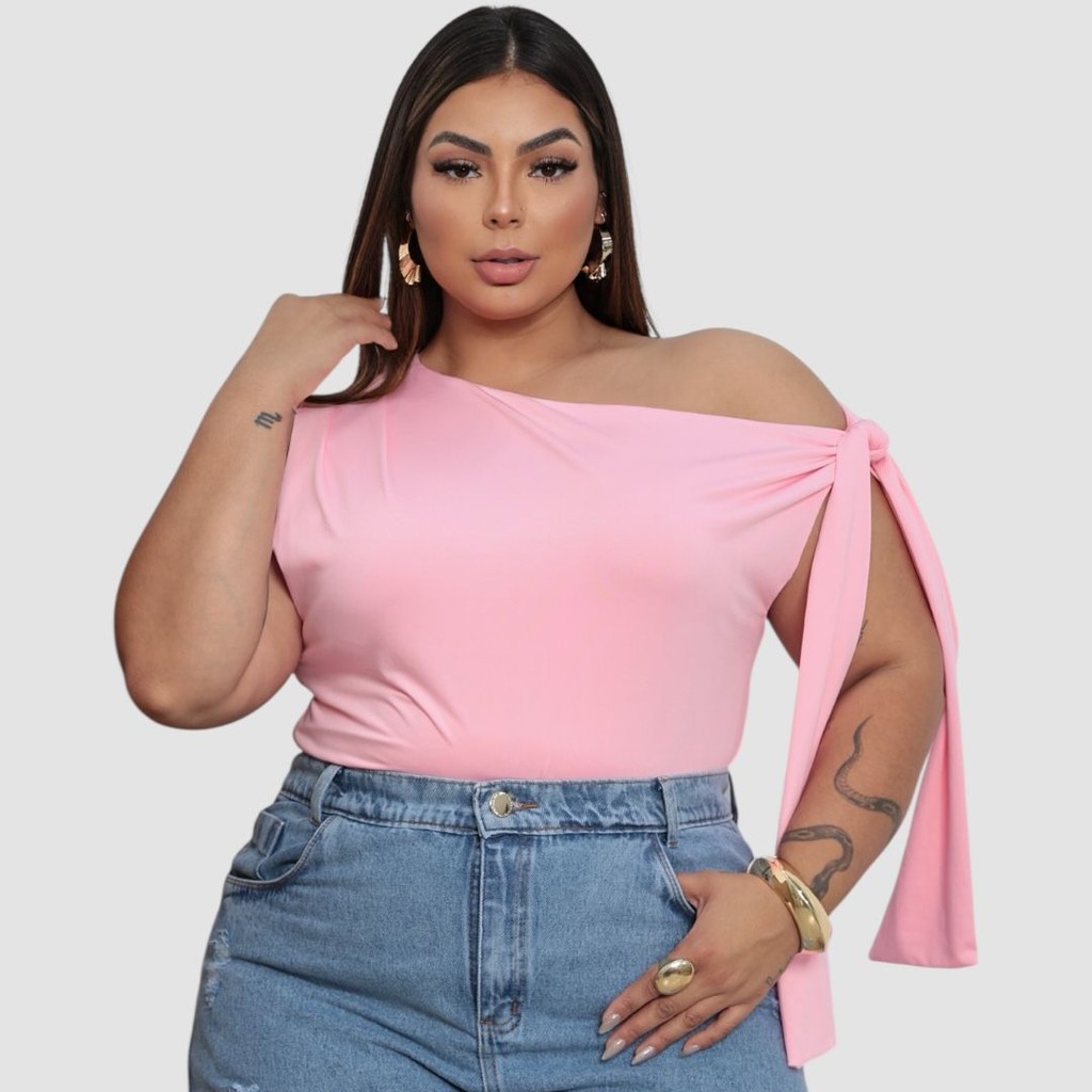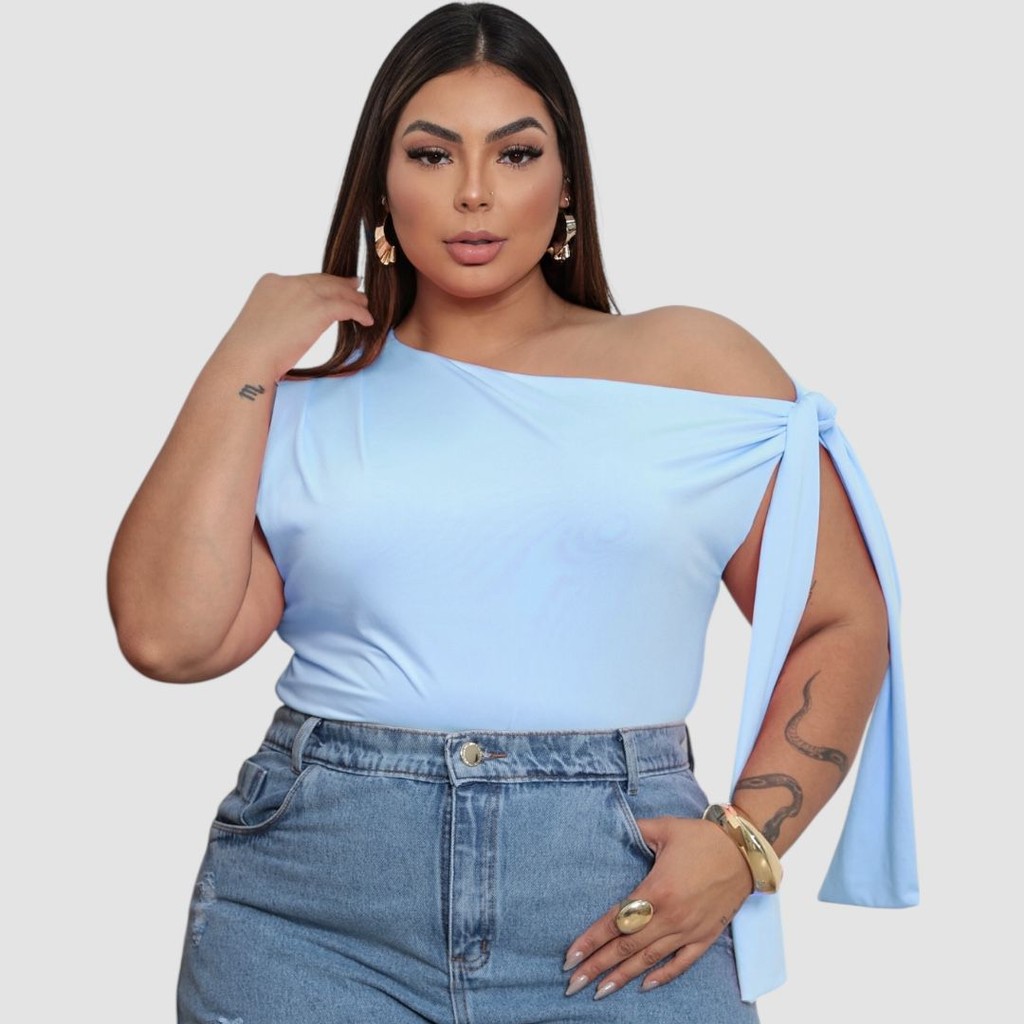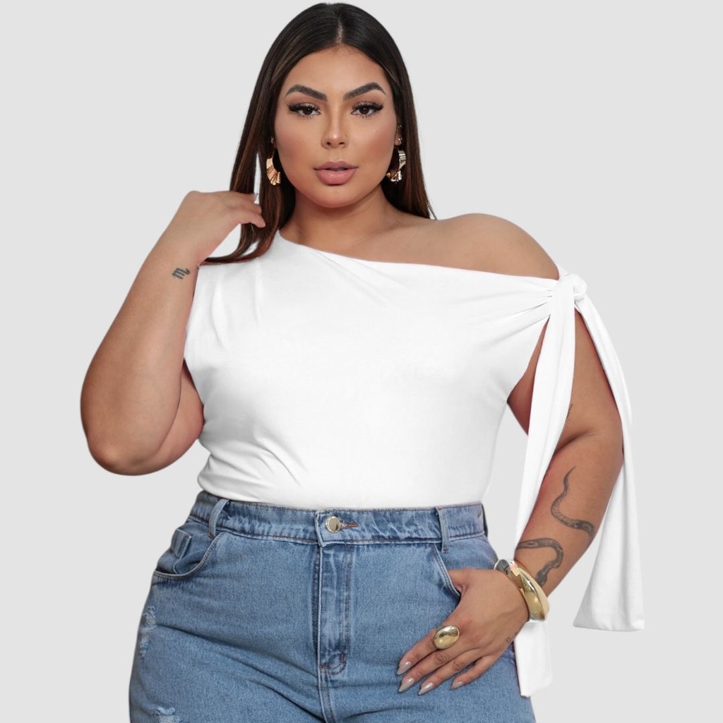 Blusa Feminina Assimétrica Decote Canoa Plus Size Suplex 2 Em 1 Com Laço Removível